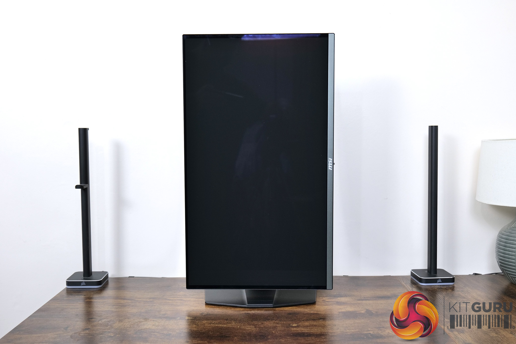 That means the display is almost entirely matte-black, with a bezel-less design on the front, while the grey chin measures approximately 14mm thick. The rear is home to the MSI dragon logo and a small RGB zone above the stand, though it's very small and obviously not visible from the front.