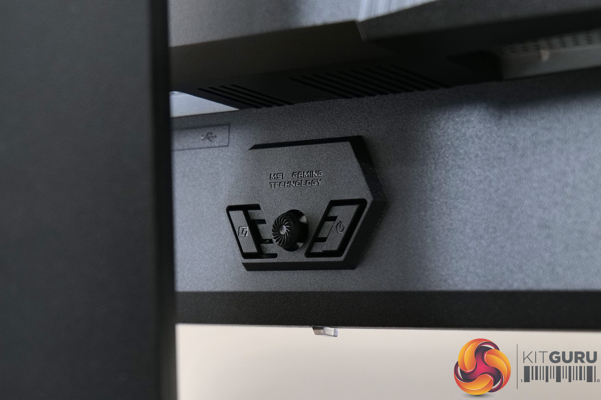 Positioned centrally on the rear of the screen, we also find a small joystick used to navigate the OSD, flanked by two buttons – one is a simple power button, the other is a customisable option which can be configured using MSI's GamingIntelligence software.