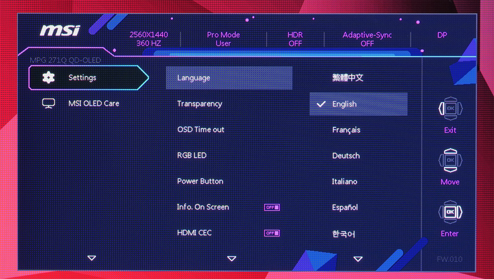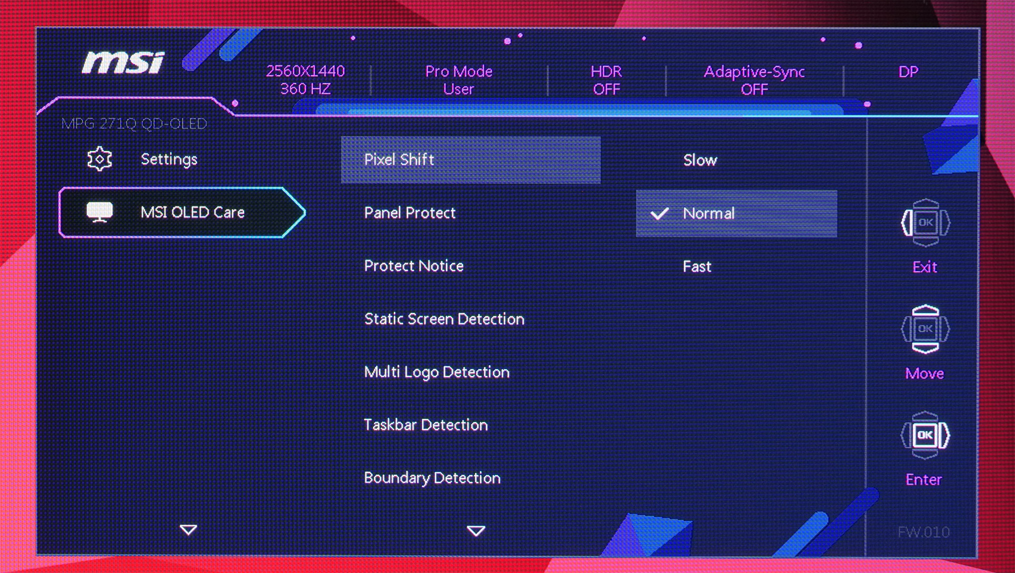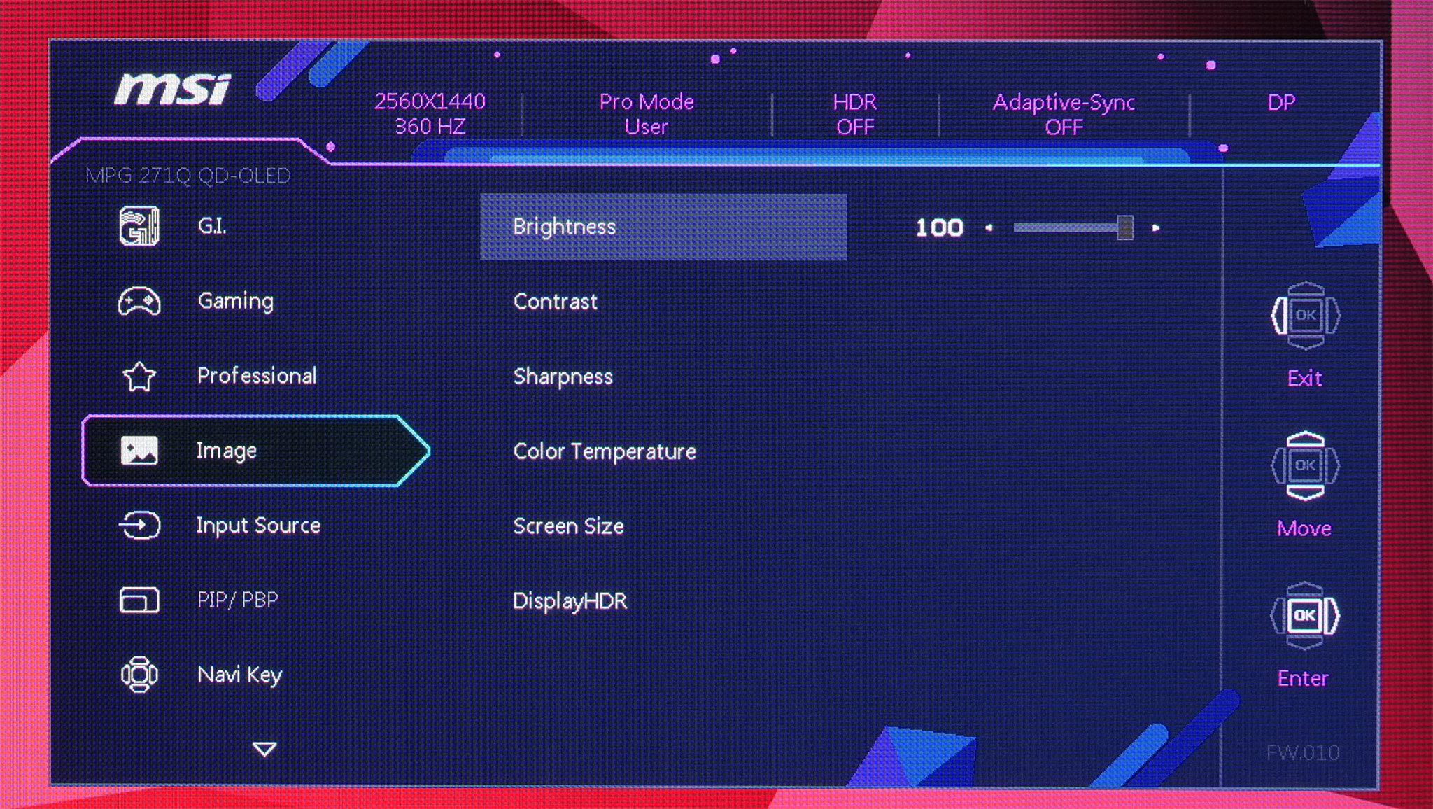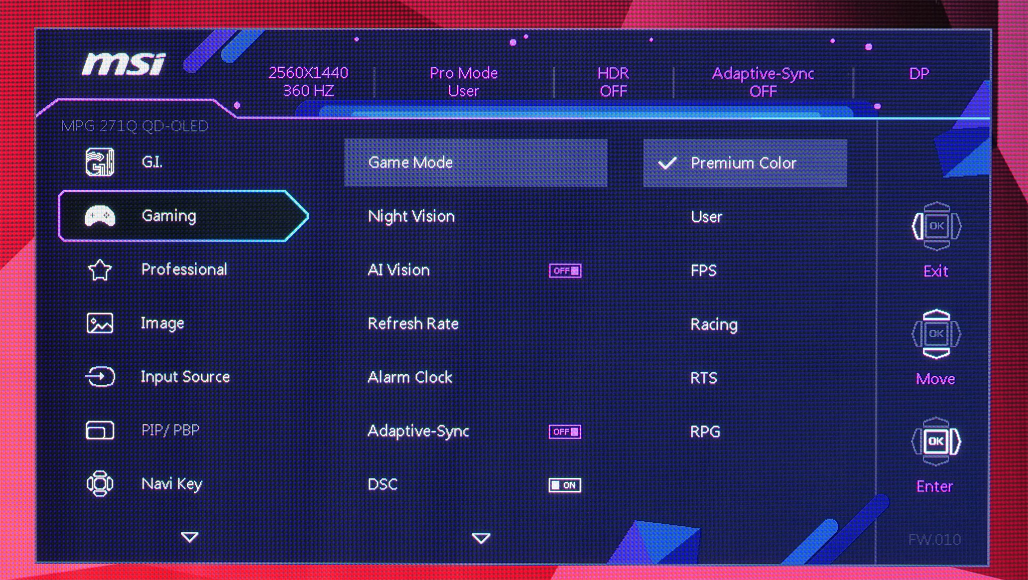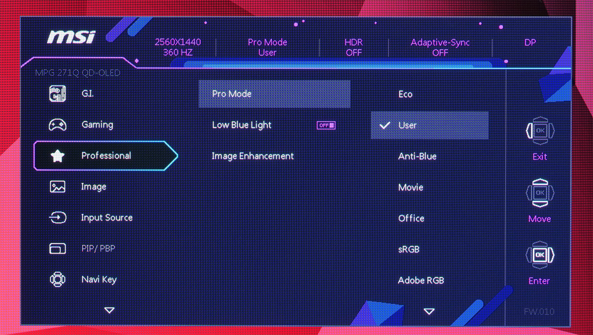 Using the same OSD system as we have come to expect from MSI, I don't have any major complaints here. It is quick to navigate using the joystick, things are sensibly laid out and it's a very well-featured selection too, with all the gamer-specific options we have come to expect as well as customisable white balance, an sRGB emulation mode and so on.