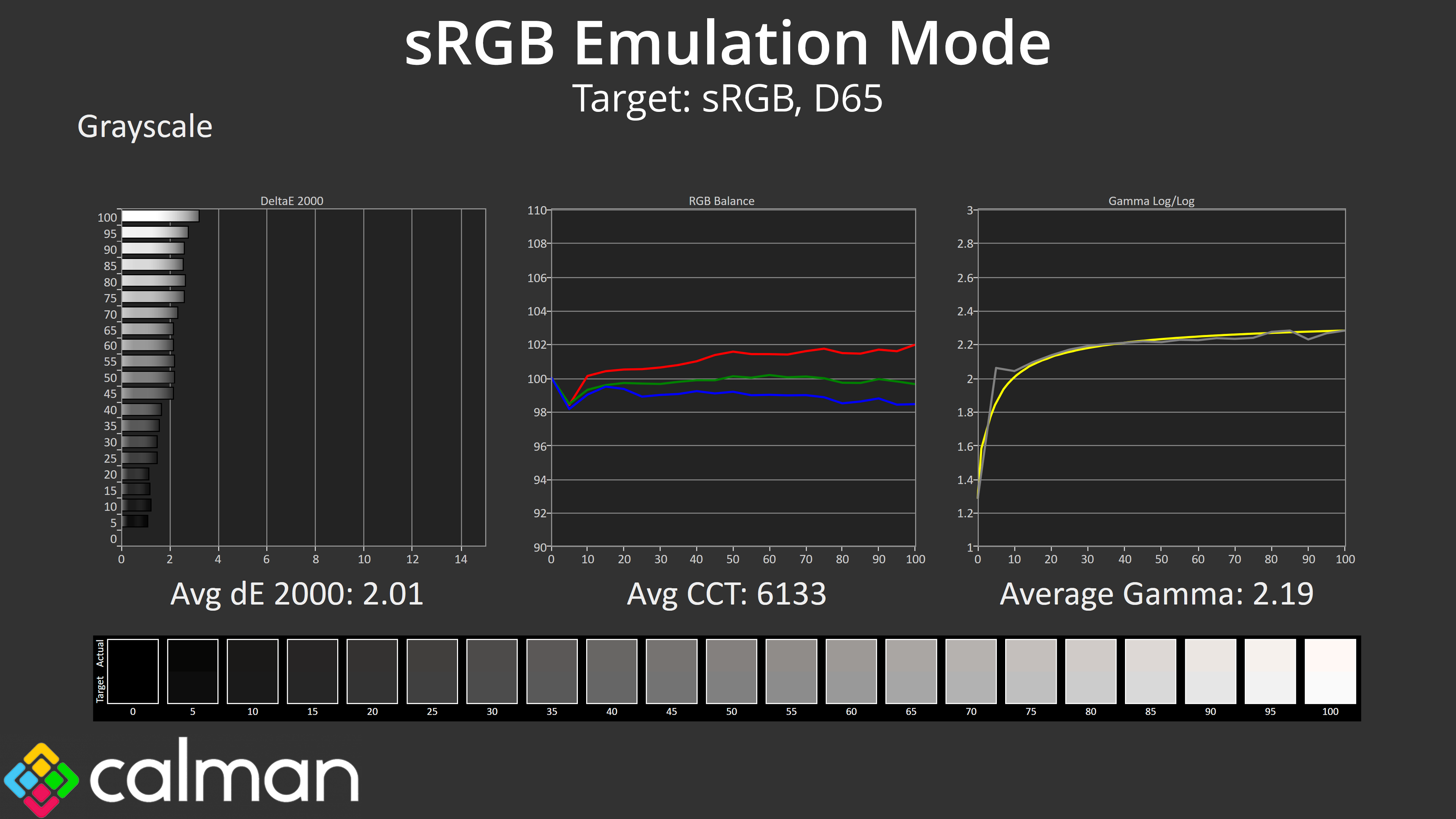This mode didn't correct the slightly warm colour balance we saw in the out of the box settings (and colour balance settings are locked down when the sRGB mode is applied), but it has improved gamma tracking to almost flawless levels, and the overall greyscale dE of 2.01 is decent.