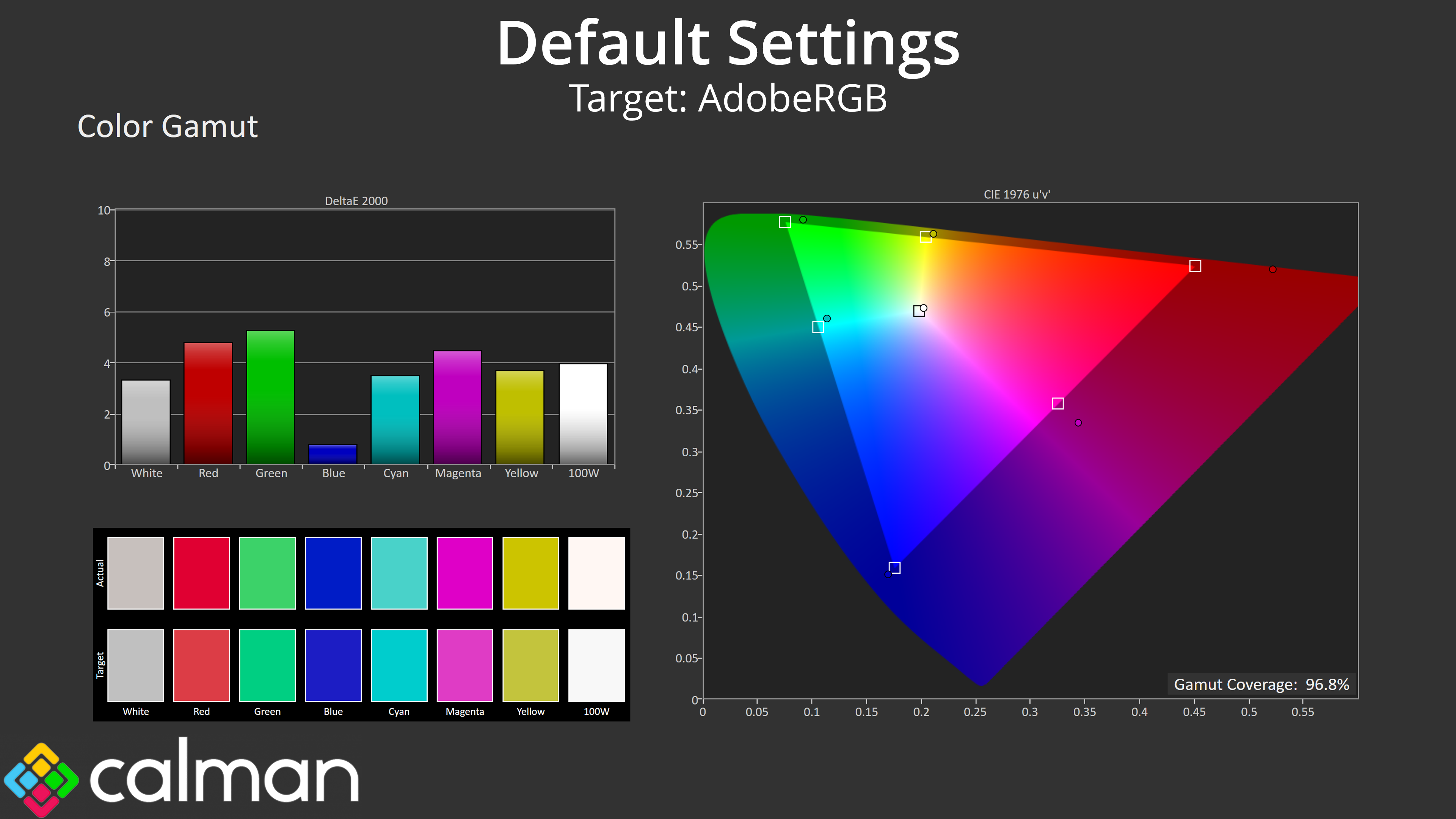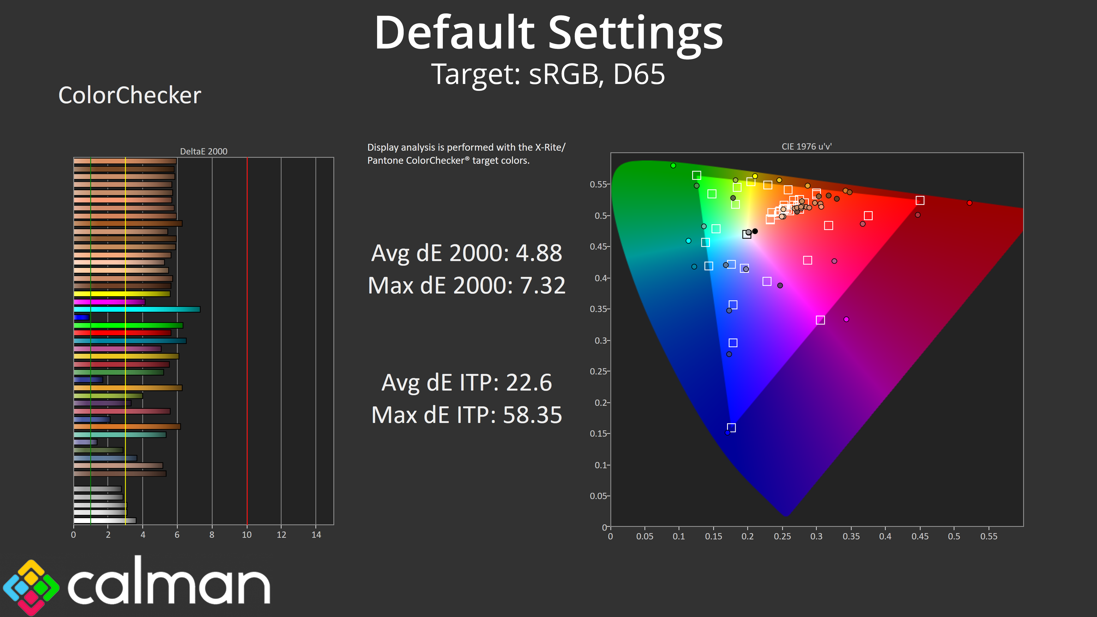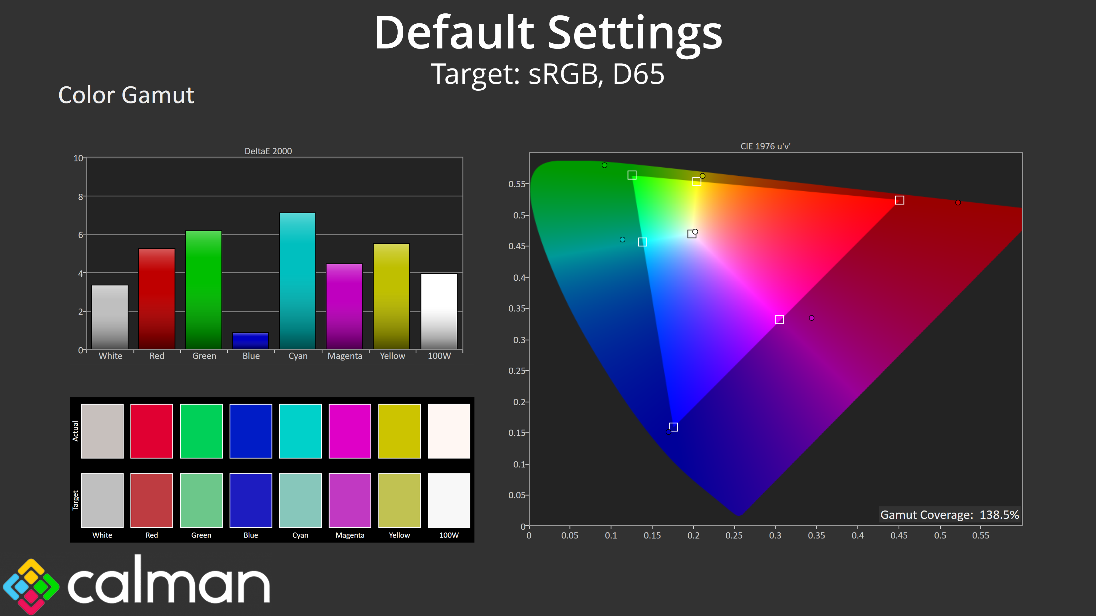 We first run these tests with the display in its out-of-the-box state, with all settings on default. If there is an sRGB emulation option or other useful mode then we may test that too. We then calibrate the screen using the Calman Ultimate software and run the tests again.