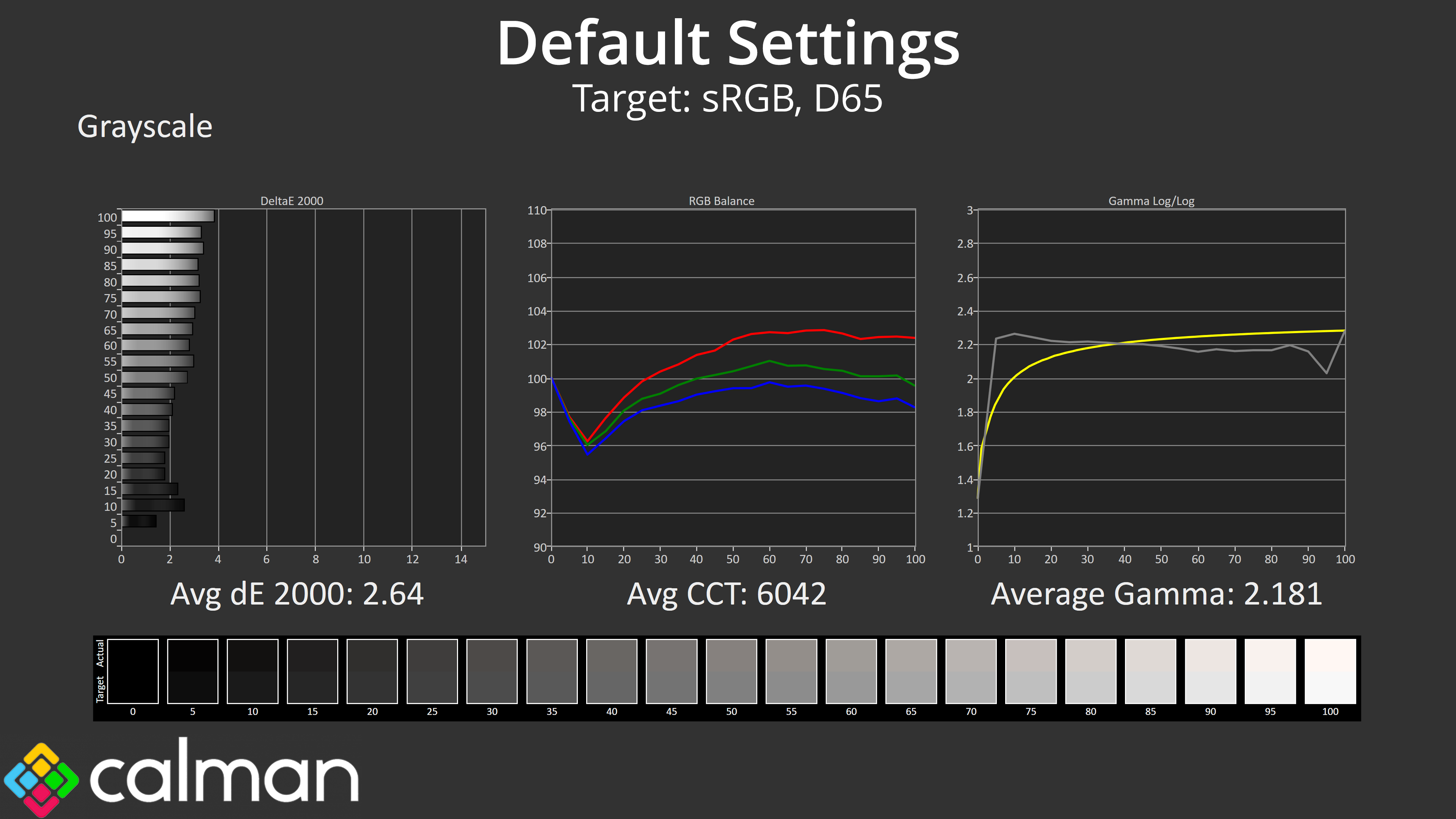 Moving onto greyscale testing, out of the box the 271QRX delivers solid results, with an average dE 2000 of 2.64. My sample does have a slightly warm average Correlated Colour Temperature (CCT) of 6042K, something we also observed from the 321URX. Gamma tracking is generally fine too, averaging 2.18, though it is slightly too low in the brighter shades.