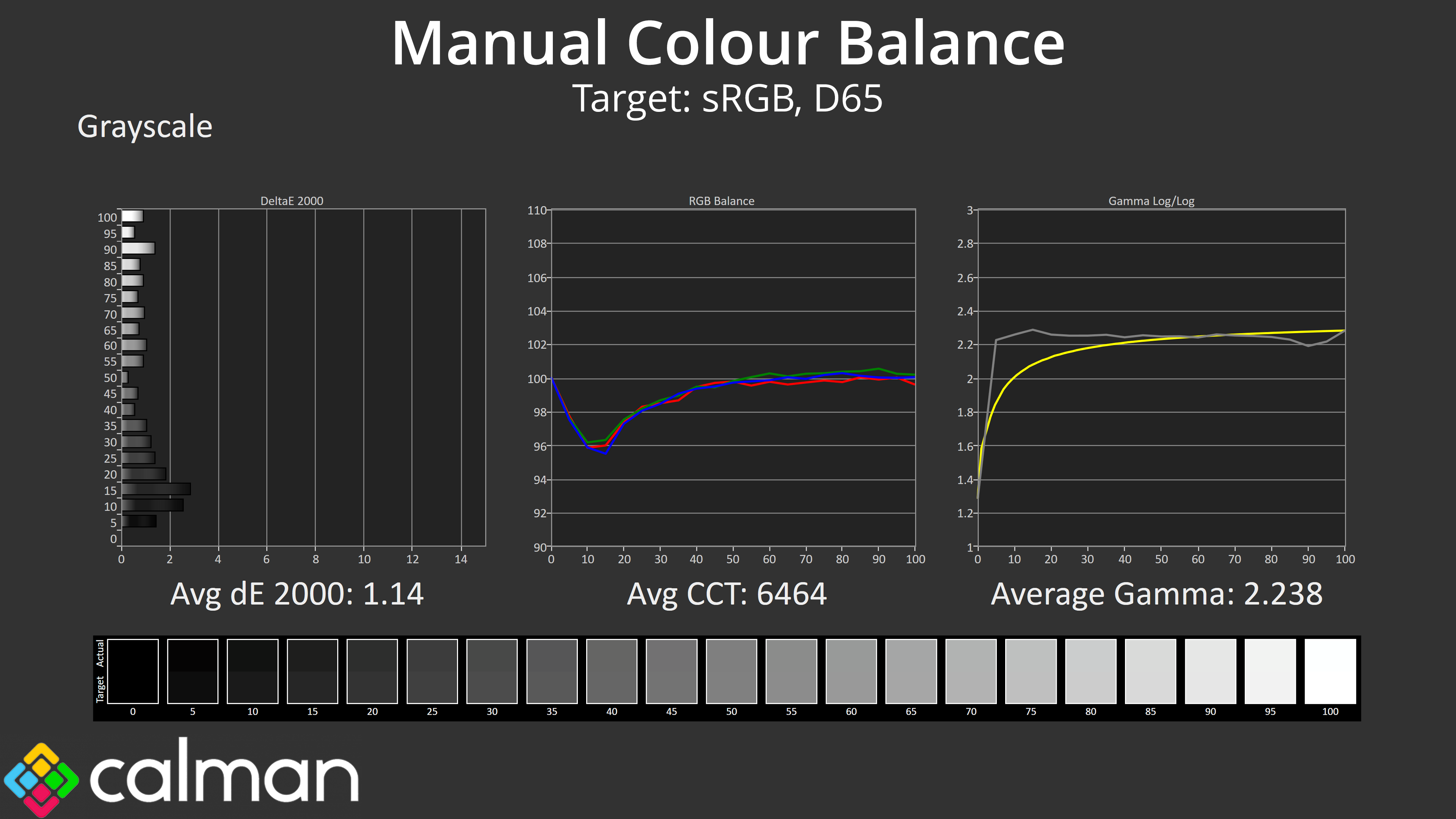 - Greyscale accuracy, measured across 20 shades, with an average colour balance reported.