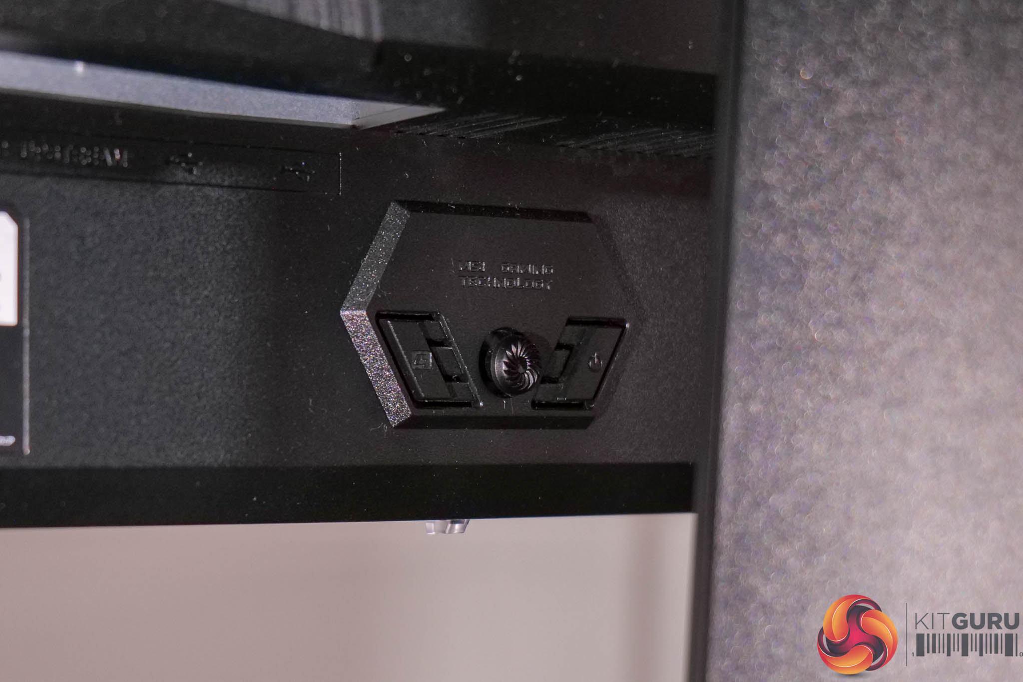The monitor controls are positioned centrally and offer a joystick for navigating the OSD, along with a power button and one user configurable button.