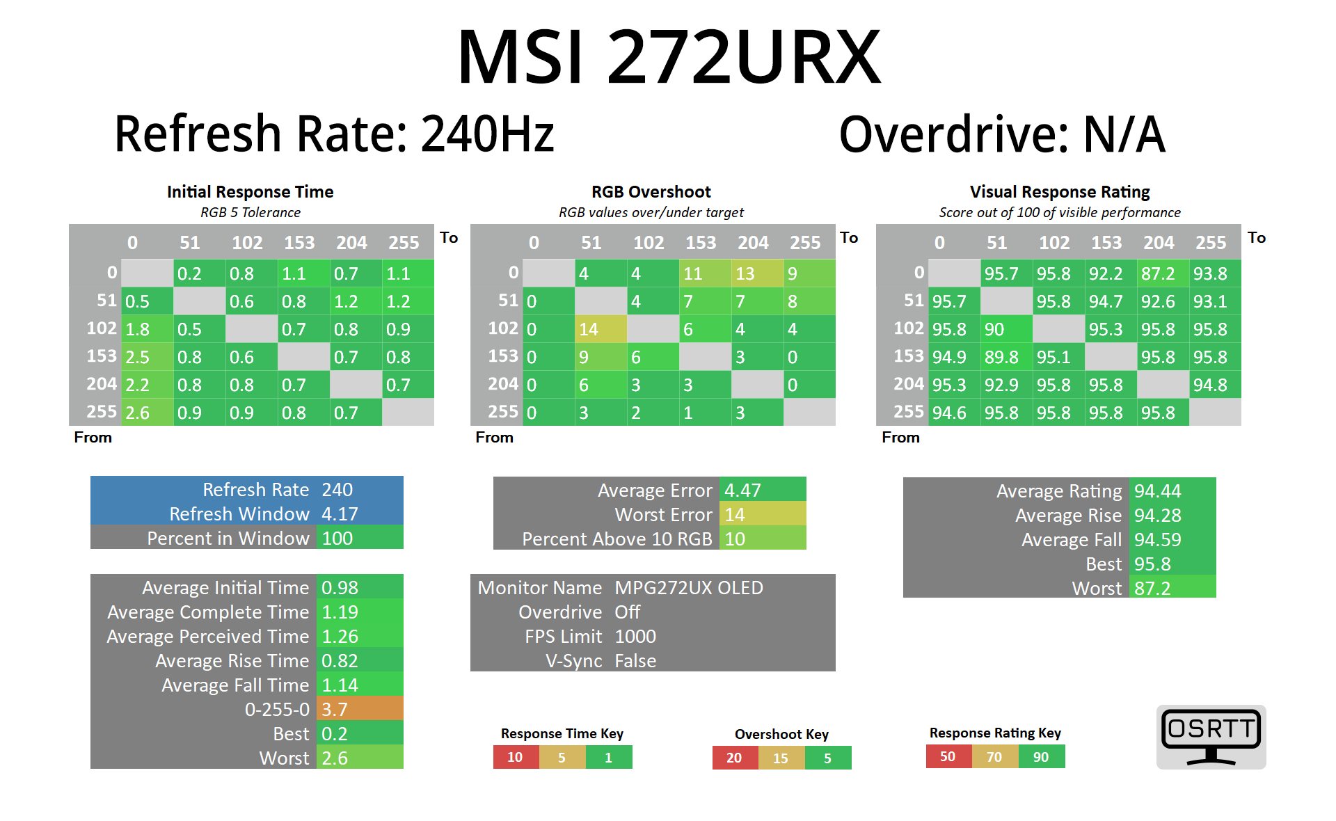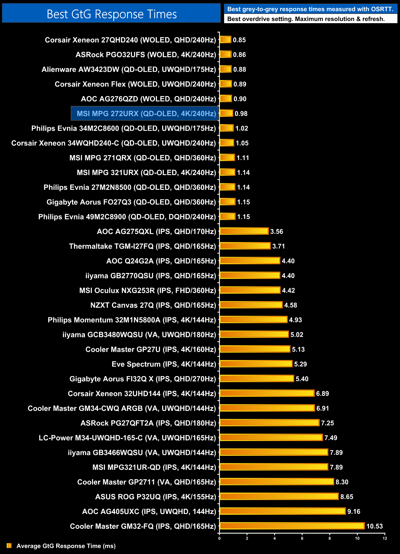 Given the 272URX is an OLED monitor, we know the response times will be fantastic – and they are, averaging less than 1ms across the board, putting this right up there with the other OLED monitors we've tested, and that is the same regardless of the refresh rate.