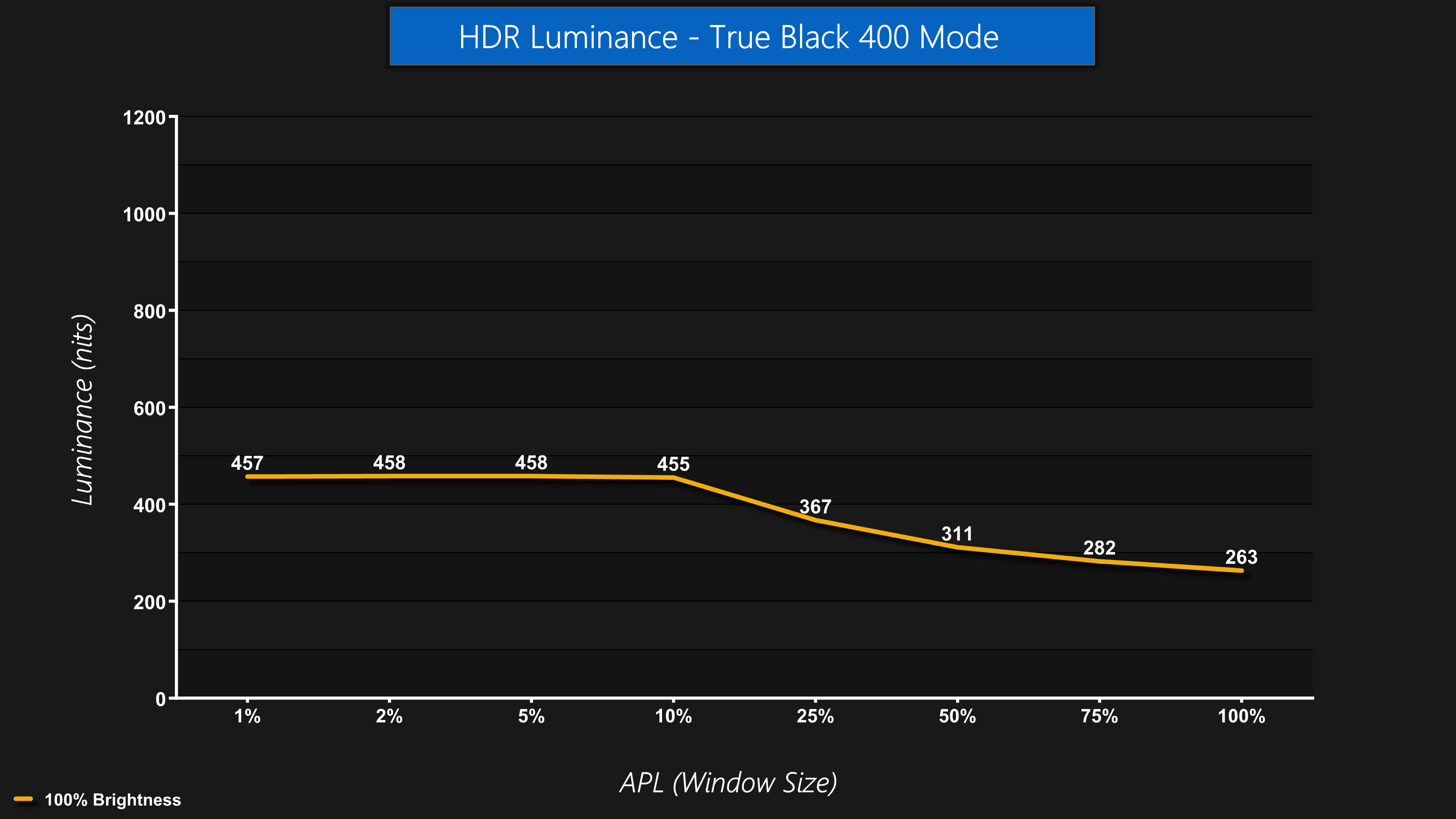 By default, the 321URX defaults to the True Black 400 mode when HDR is enabled. This limits brightness in HDR mode to about 460 nits, which is sustained up to a 10% APL, after which brightness slowly declines until it hits a full screen figure of 263 nits.