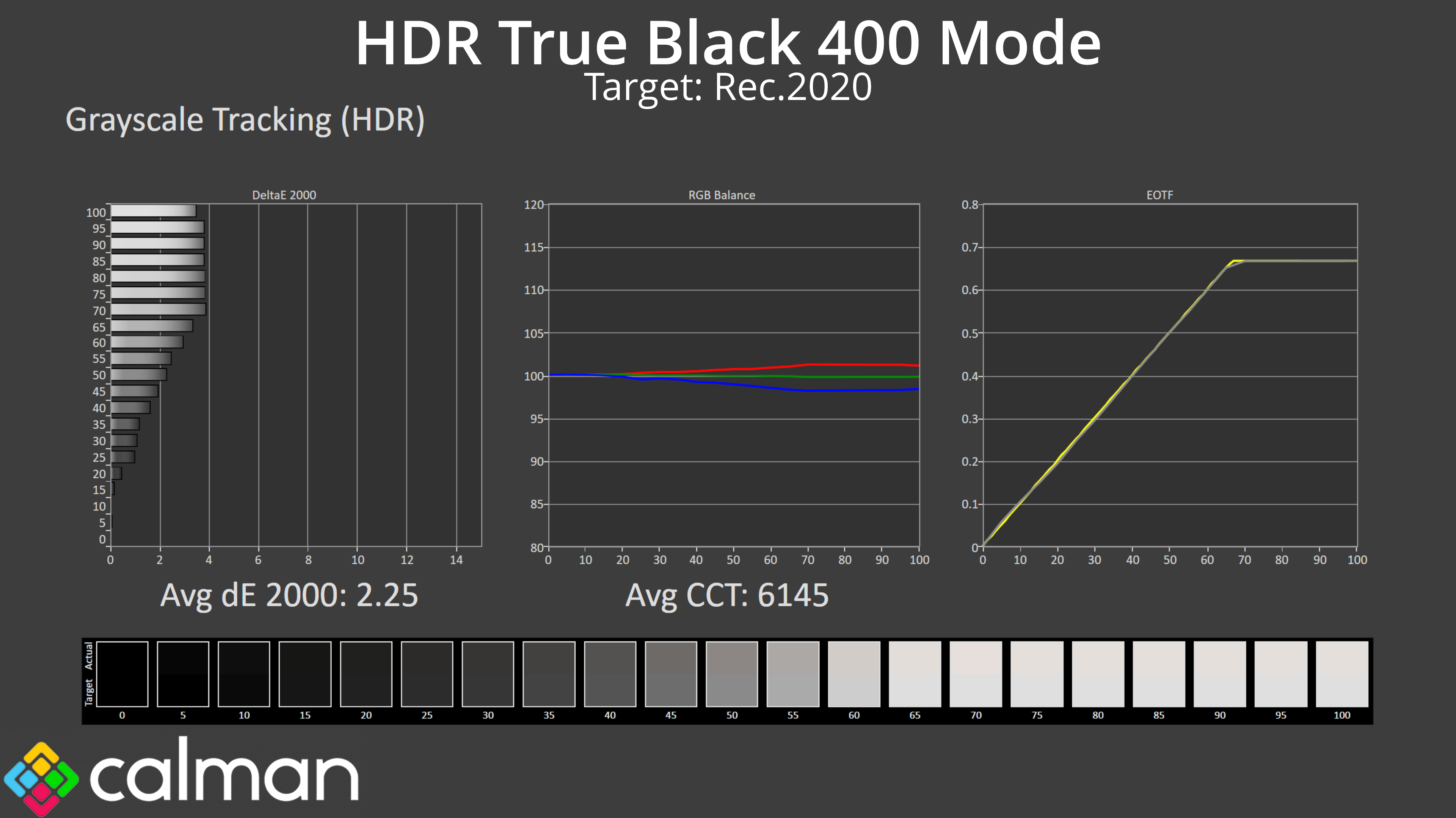 The difference between the two modes other than brightness is quite hard to spot. RGB balance is very similar, as is greyscale dE. There is just a tiny difference in the EOTF tracking, with the HDR Peak 1000 mode rolling off slightly early compared to the True Black 400 mode, but both are generally accurate and don't pose any headaches for use with HDR content.