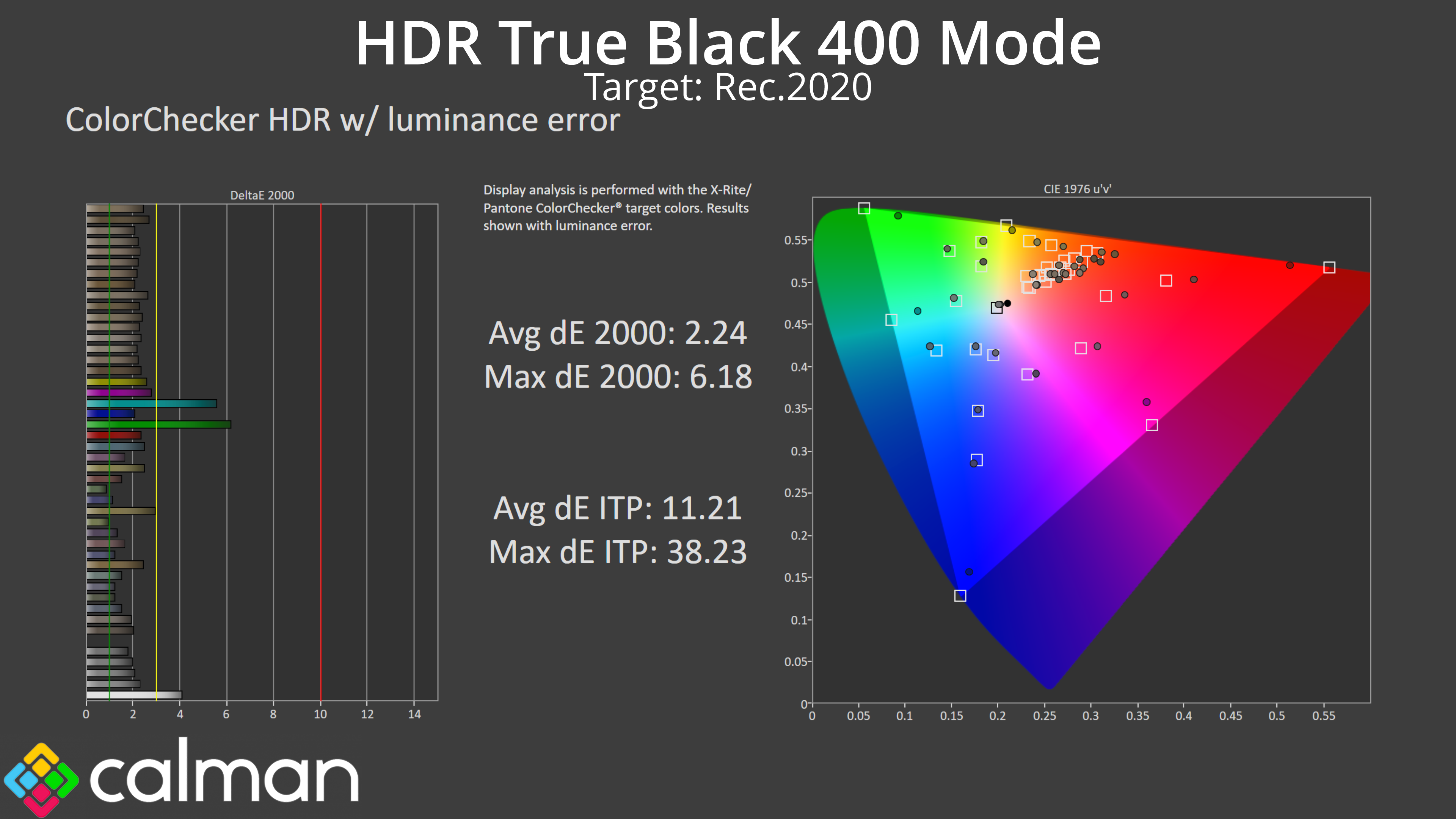 Likewise, colour accuracy with HDR enabled is very similar between the two modes, each deliver average dEs of around 2.2-2.4. The biggest offenders are the 100% cyan and 100% green channels, which the monitor can't display accurately due to its sub-100% coverage of the Rec.2020 colour space.