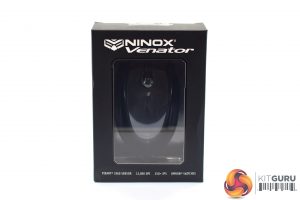 The Ninox Venator ships in a simple box made of thin cardboard. The mouse is visible through a plastic window on the front of the box.