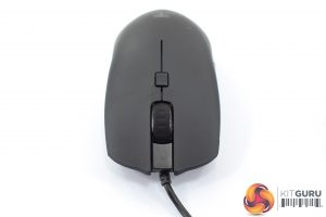 Over at the top of the mouse, we find a large scroll wheel, a single button for switching profiles, as well as the primary buttons. For those interested, the primary buttons use Omron D2FC-F-K(50M) switches, rated for 50m clicks.