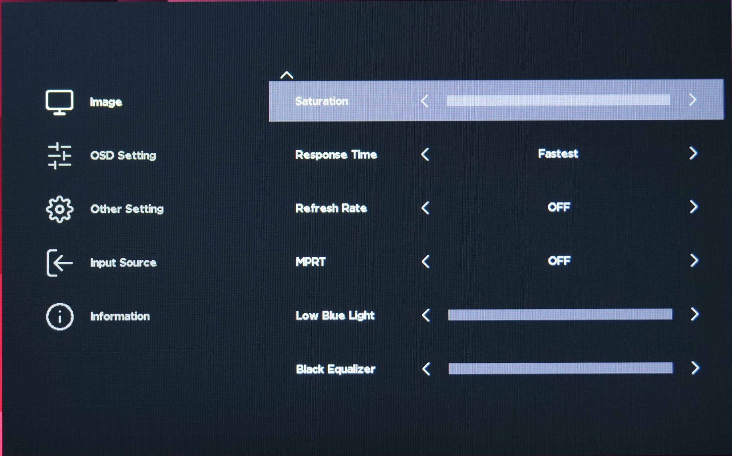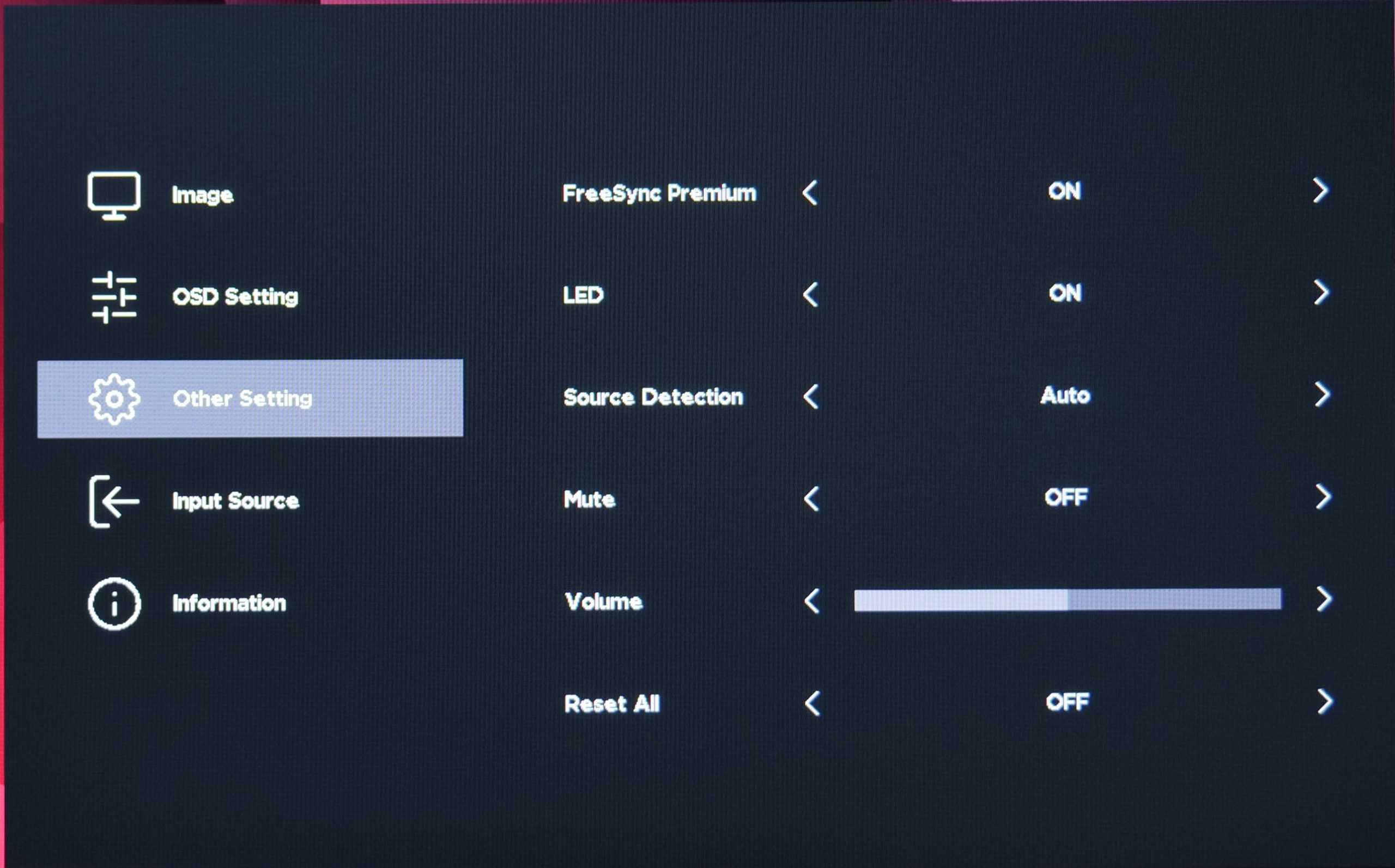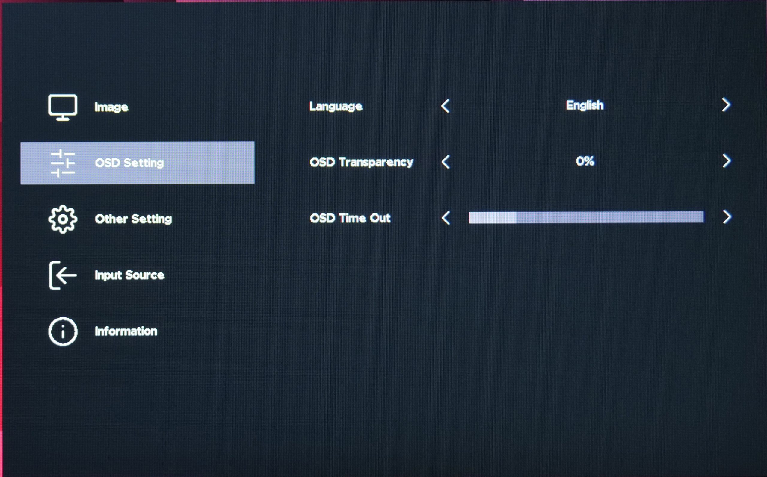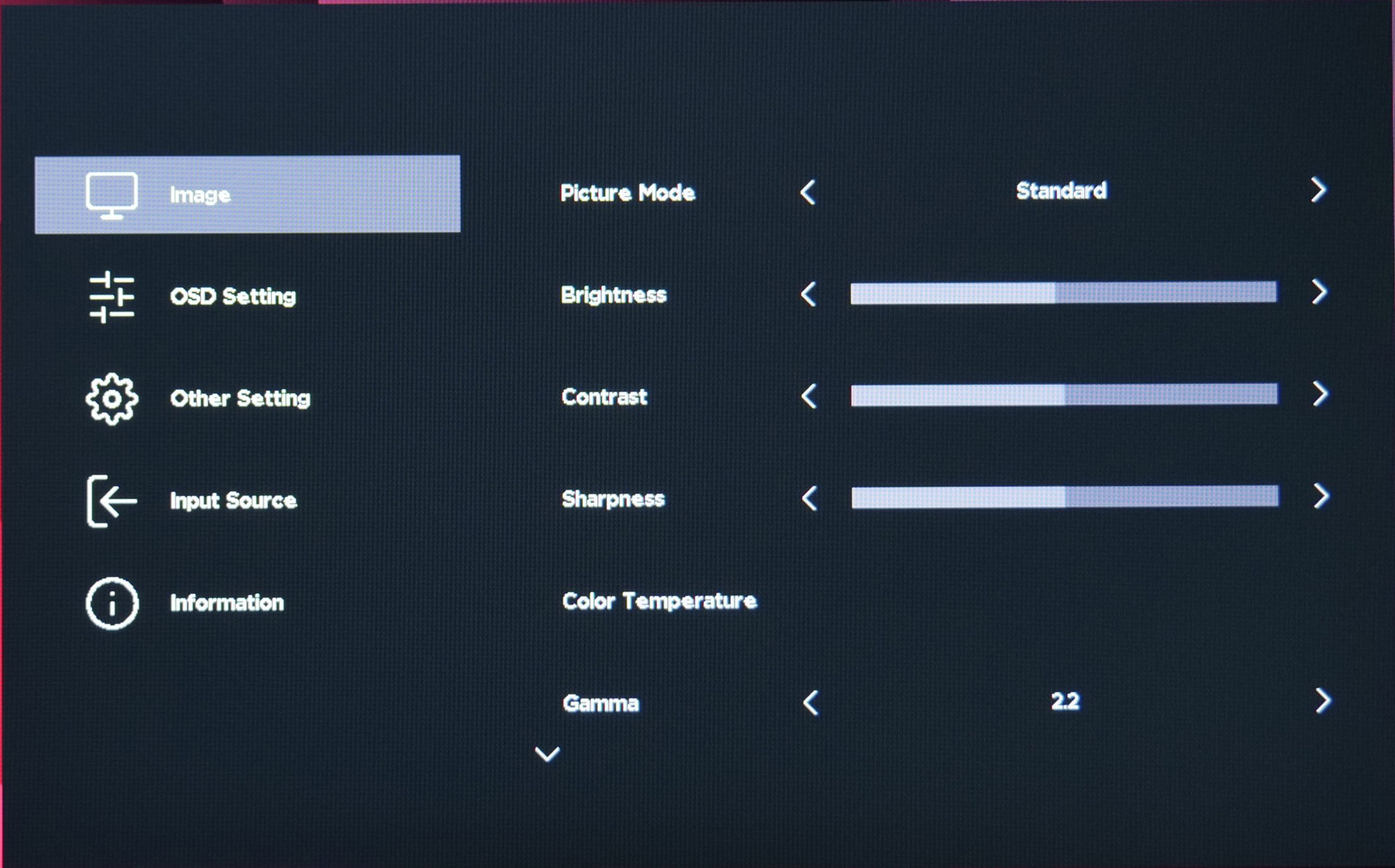 As expected, the OSD isn't quite fully fleshed-out just yet, with no option for things like an on-screen crosshair or a shadow boost setting. I also find it a bit peculiar that none of the adjustable settings like Brightness or Contrast give you a number out of 100 so you know what percentage you are currently using. You can still adjust those values between 1 and 100, you just won't know the exact setting you are currently using, which is a bit strange.