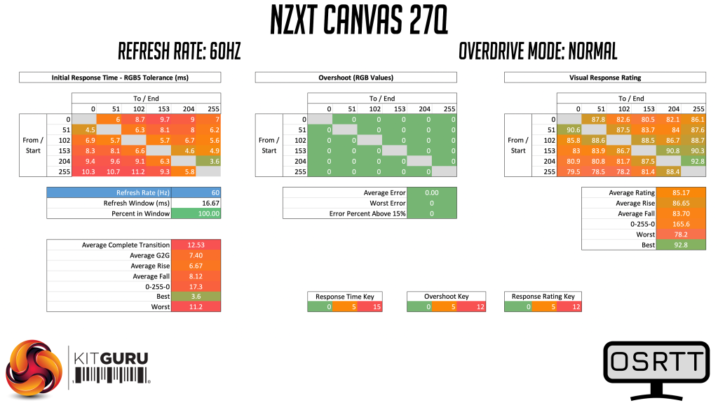 Monitor response time testing is a new addition to our reviews, where we use the Open Source Response Time Tool (OSRTT), developed by TechTeamGB. This measures grey-to-grey response times and presents the results in a series of heatmaps, the style of which you may be familiar with from other reviews.