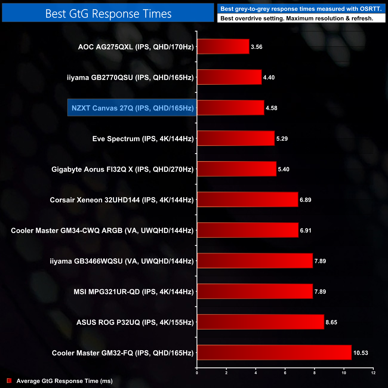Looking at the best response times in comparison to the other monitors we have tested, performance is strong from the Canvas 27Q. Granted, it's not quite as fast as the AOC AGON AG275QXL, but it's up there. It's also trading blows with the iiyama GB2770QSU, which is admittedly a less premium design, but if you're only interested in raw gaming performance, it's a match for the 27Q.