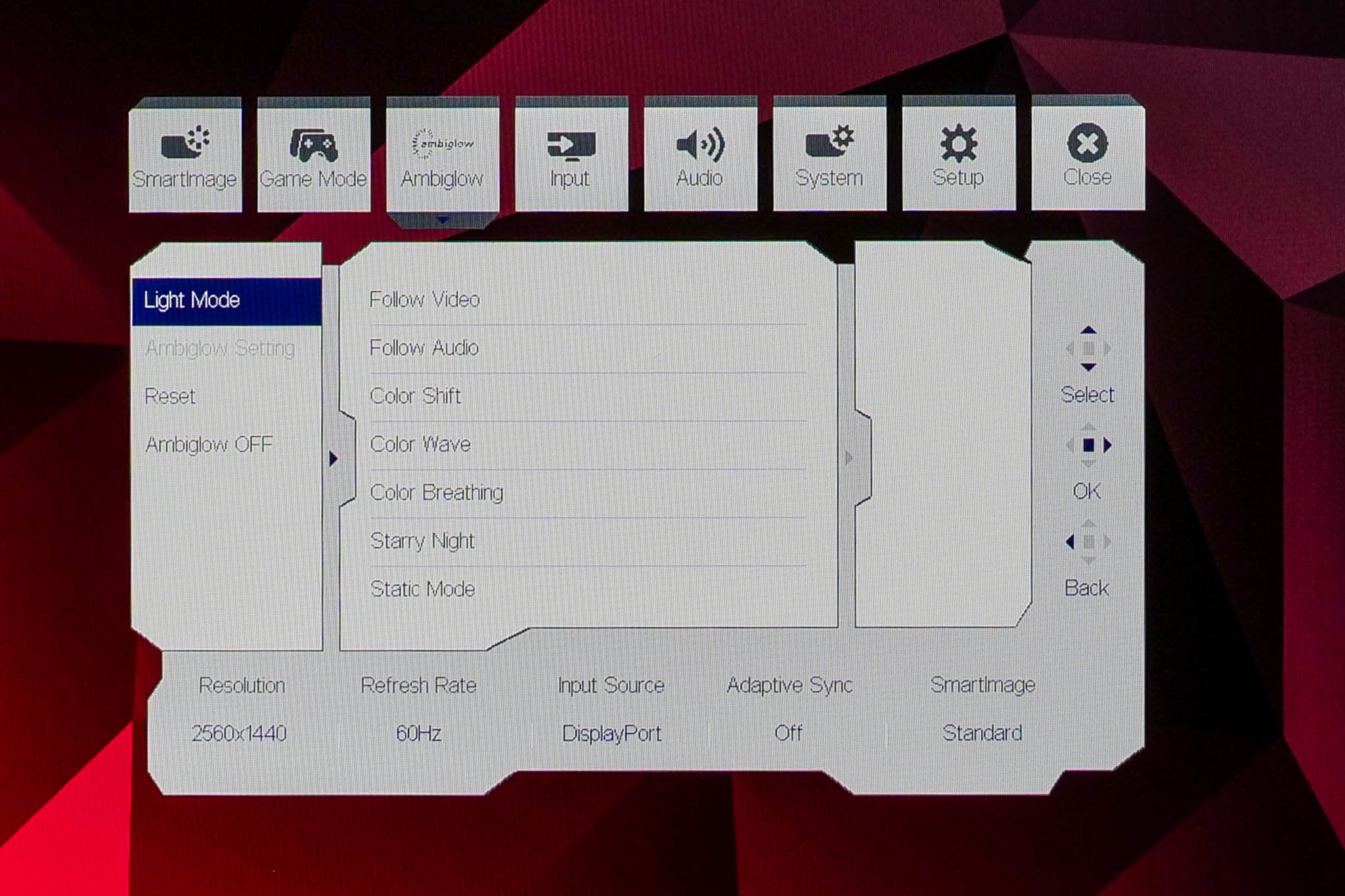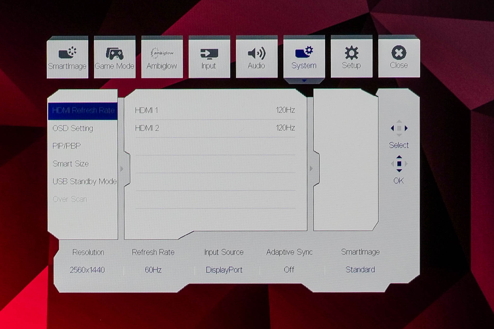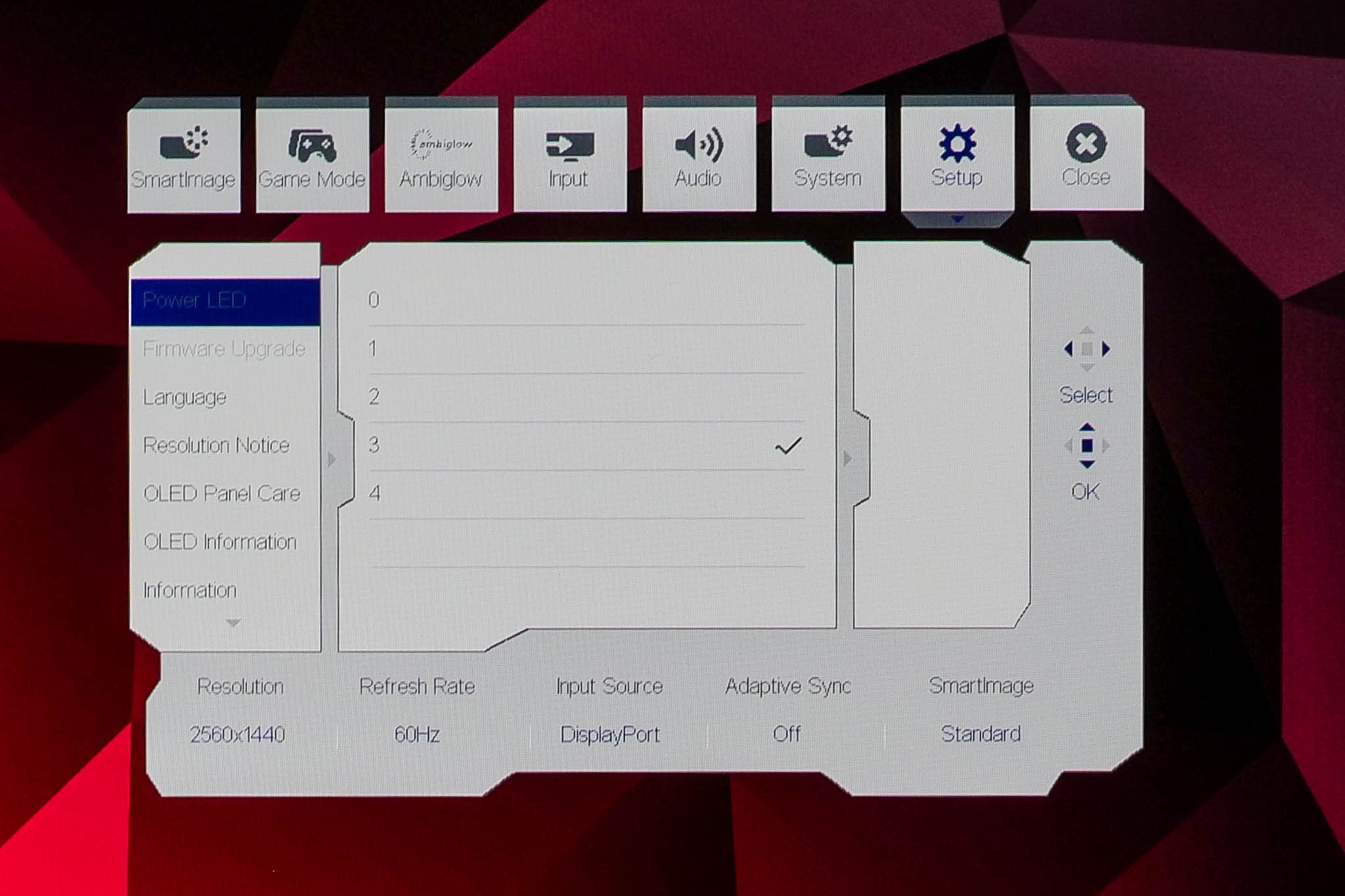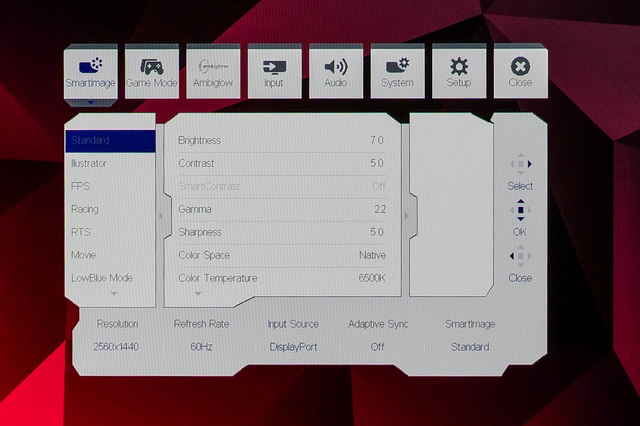 The OSD system appears unchanged since we last looked at an Evnia screen. It's perhaps not the prettiest UI going, but it has plenty of features and is easy to navigate using the joystick. My only real complaint is that there are no customisable shortcut options – being able to quickly adjust brightness without diving into the main OSD itself is always a welcome feature to me.