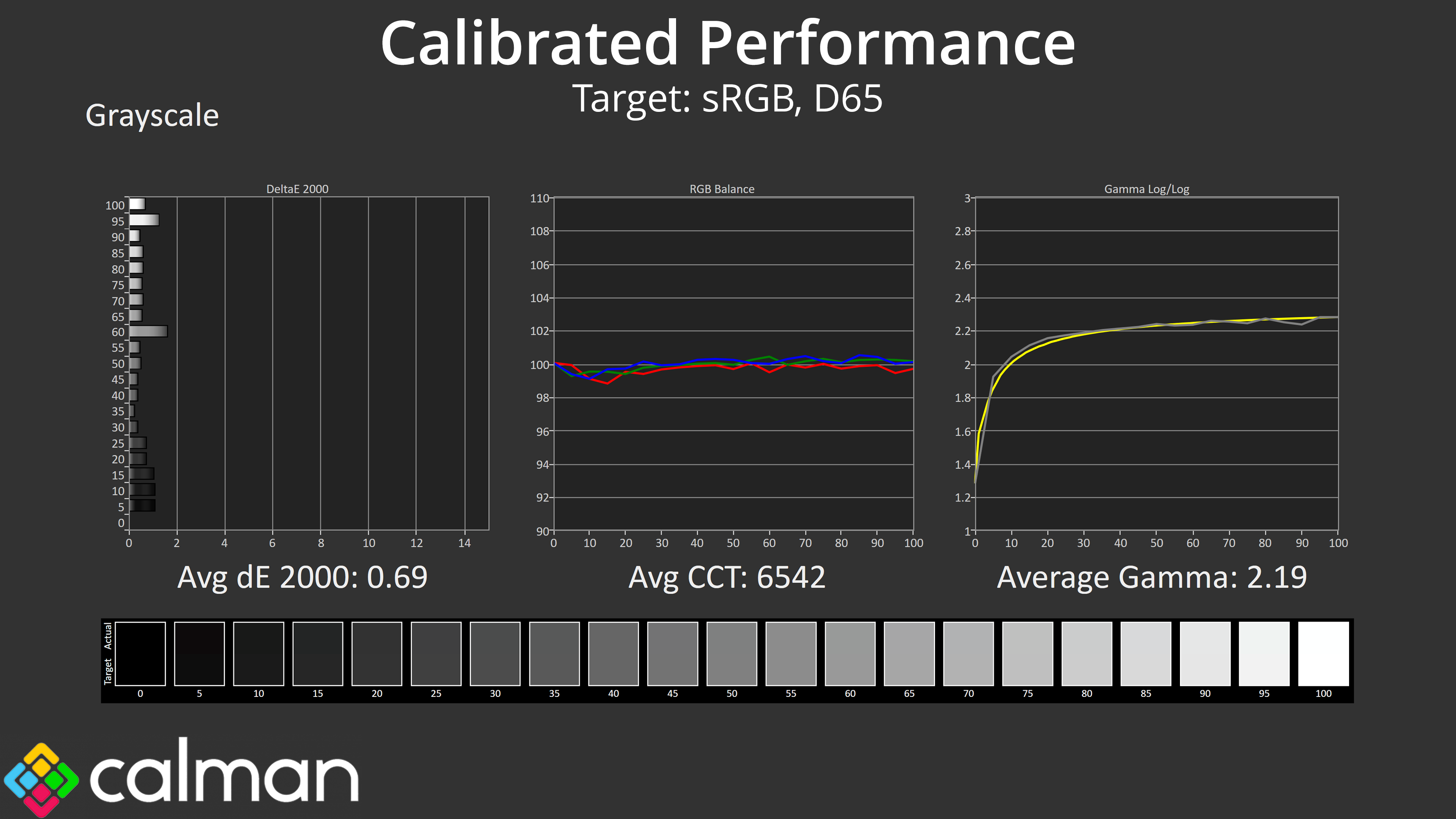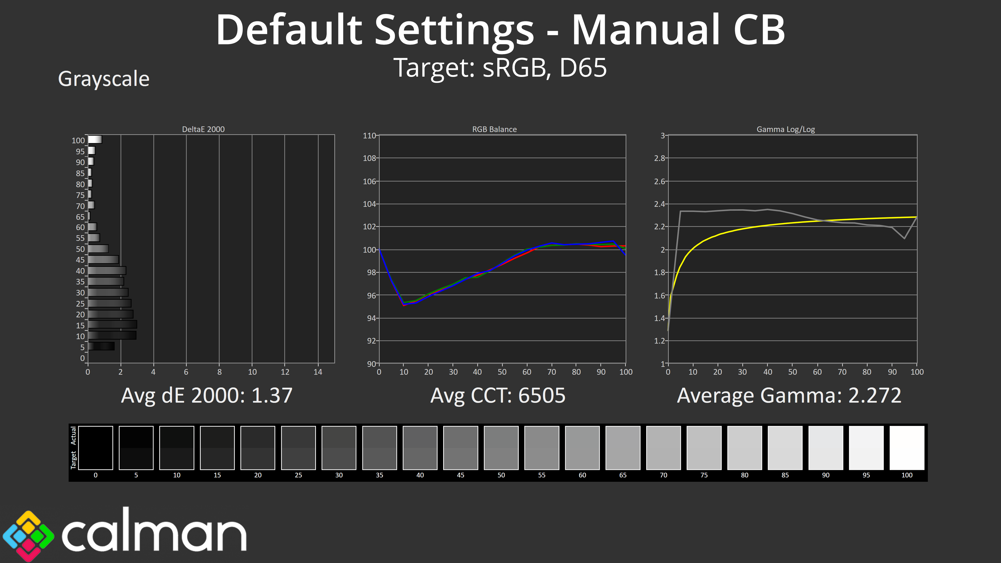 Thankfully Evnia does now support manual colour balance and this makes a huge difference. By dropping the red channel to 95 and the green channel to 97, leaving blue at 100, we improved the average CCT to 6505K, which is basically perfect. This, with no change to the gamma tracking, is enough to improve the greyscale average dE 2000 to just 1.37 – well worth doing!