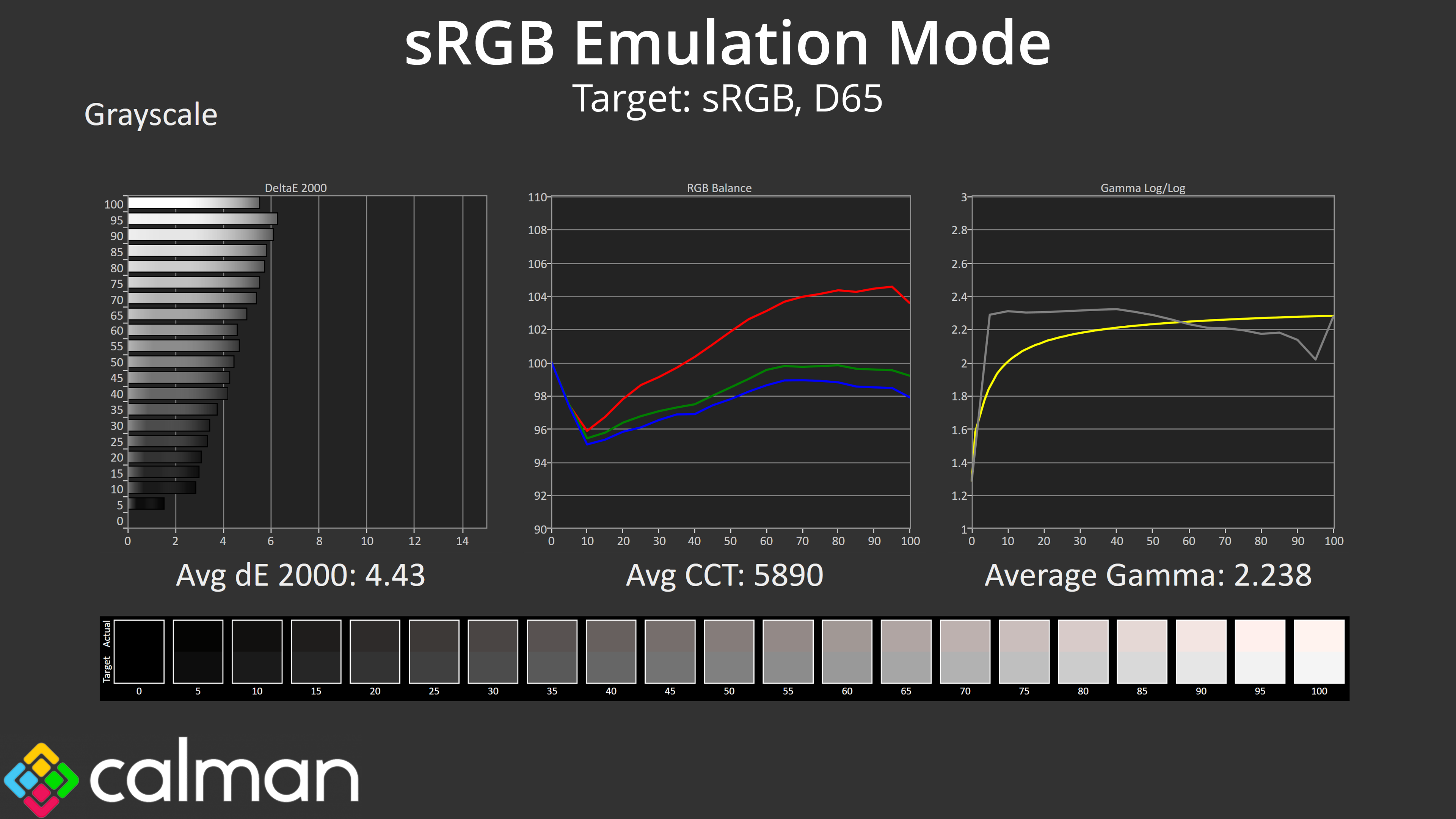 Evnia also includes a sRGB emulation mode within the settings, but it uses the same colour temperature setting as above, meaning overall accuracy isn't improved by that much – and that is a shame. Don't get me wrong, it is better than native for sRGB accuracy, with a very slight improvement to gamma tracking too, but it's still far from perfect. You could still use a manual colour balance in the sRGB mode though, which is something.