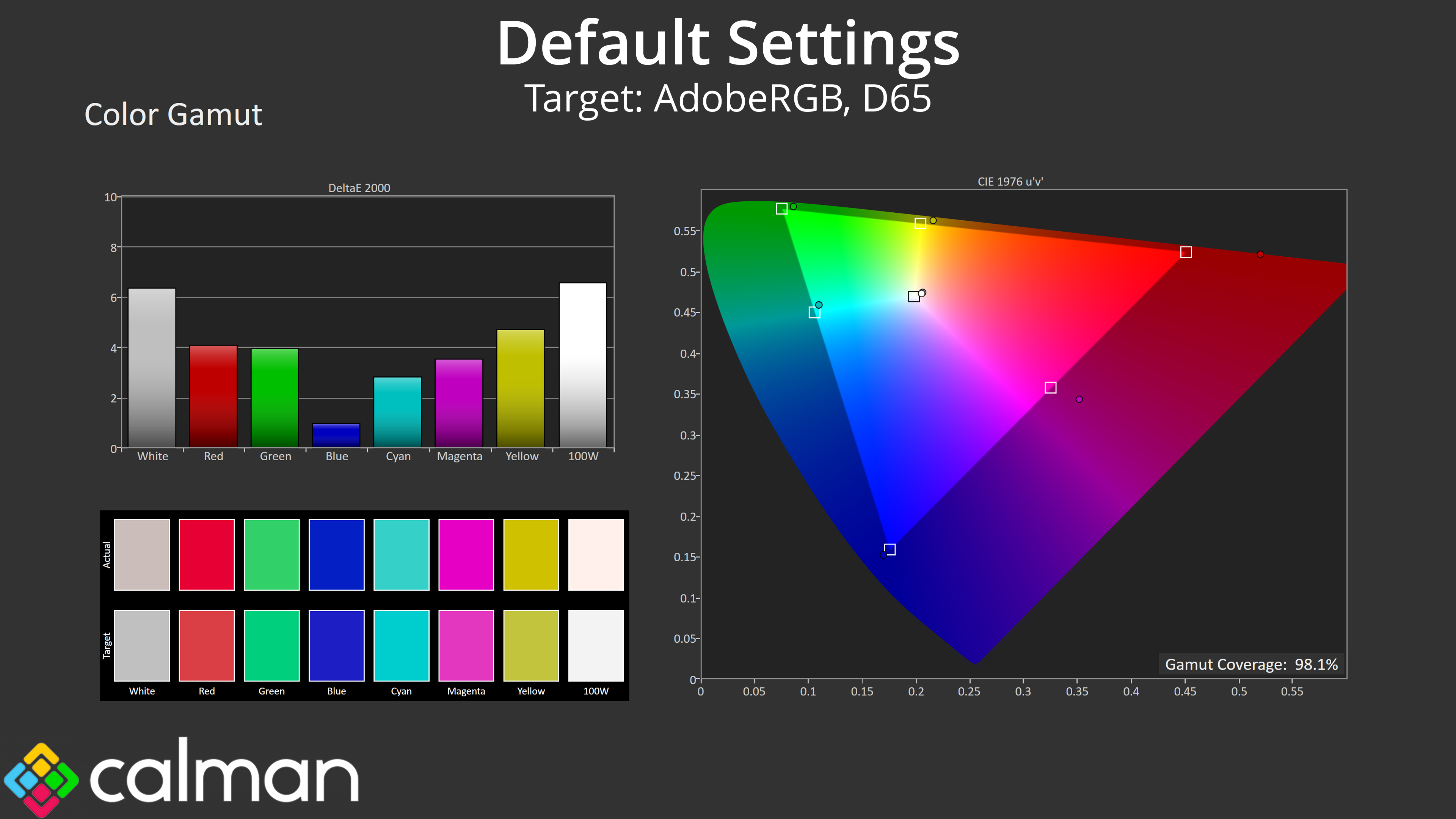 We first run these tests with the display in its out-of-the-box state, with all settings on default. If there is an sRGB emulation option or other useful mode then we may test that too. We then calibrate the screen using the Calman Ultimate software and run the tests again.