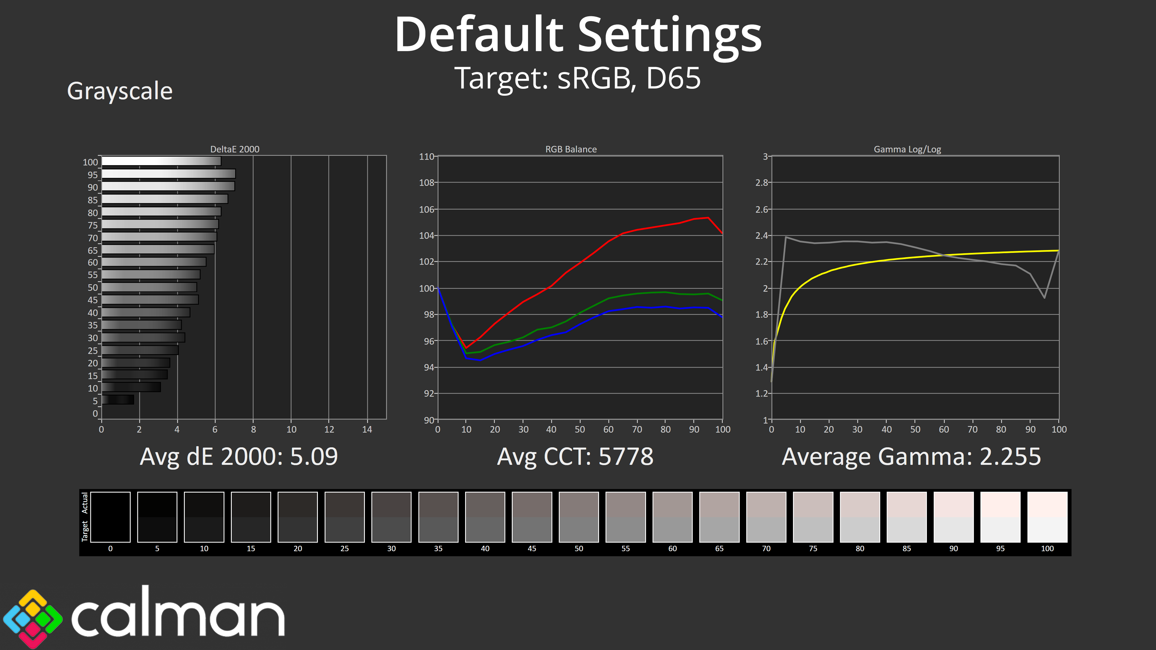 The second issue is gamma, which is too high for dark shades and then slightly too low for brighter shades. Overall, not the best factory calibration we've ever seen, and as such the greyscale average dE 2000 of 5.09 is quite high.