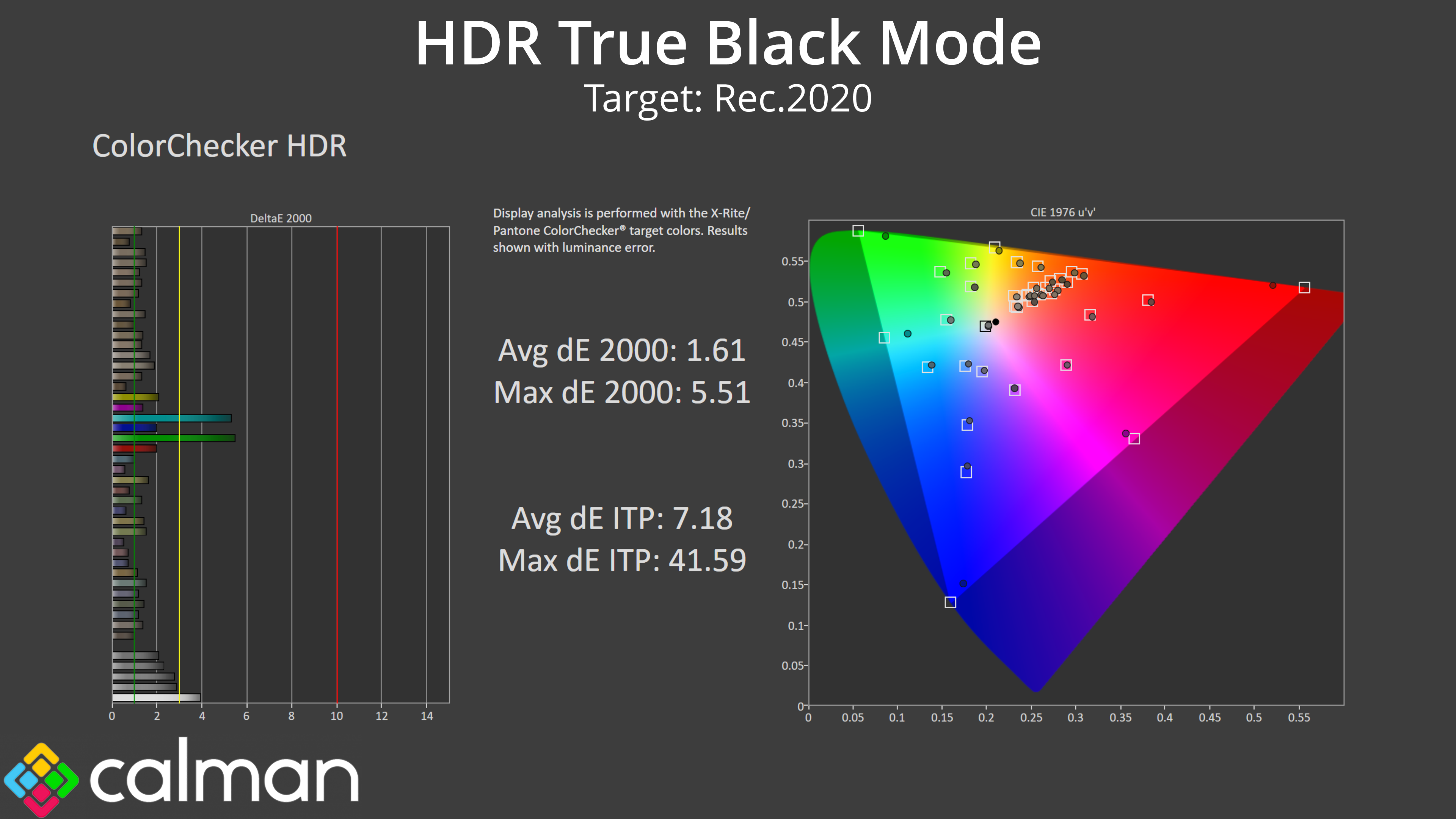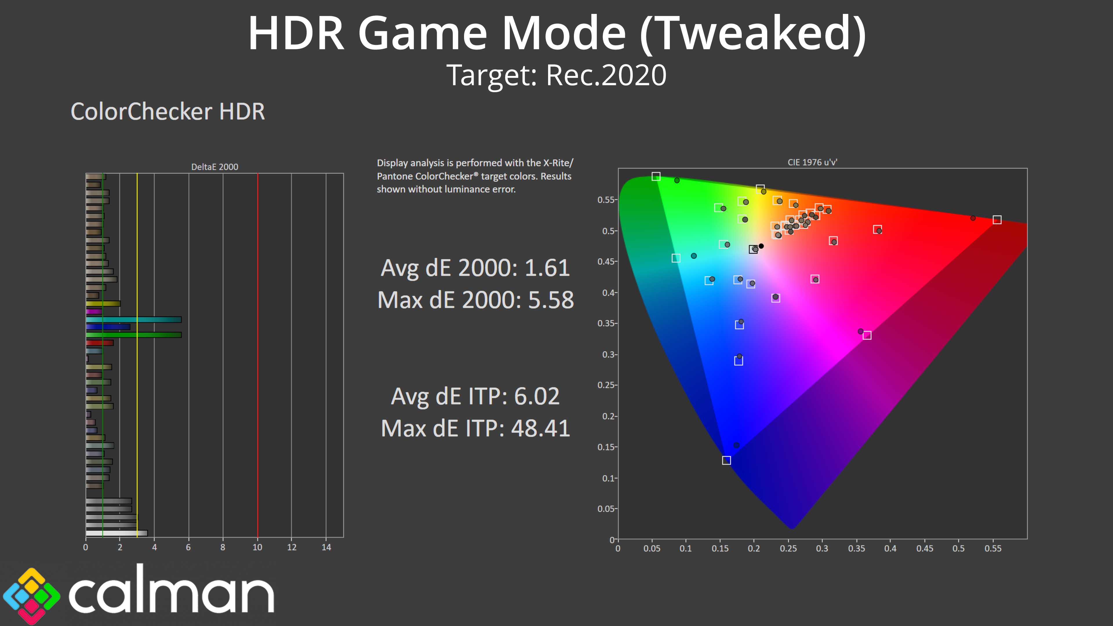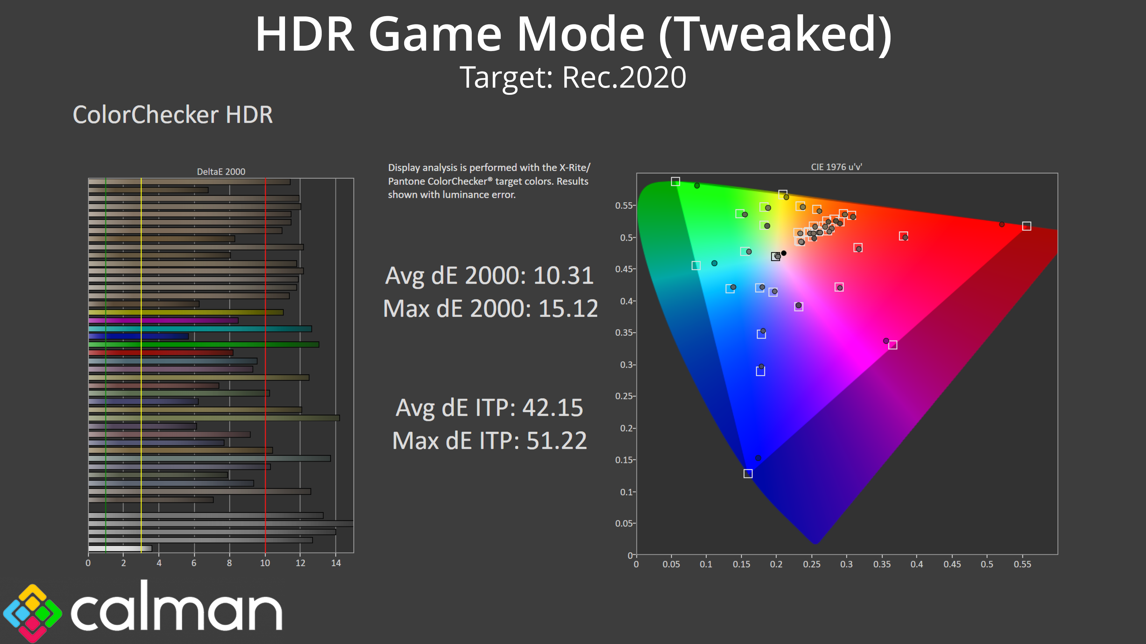 That's illustrated by our HDR colour tests. The HDR Game Mode looks great when luminance error is not taken into account, with an average dE 2000 of 1.61.