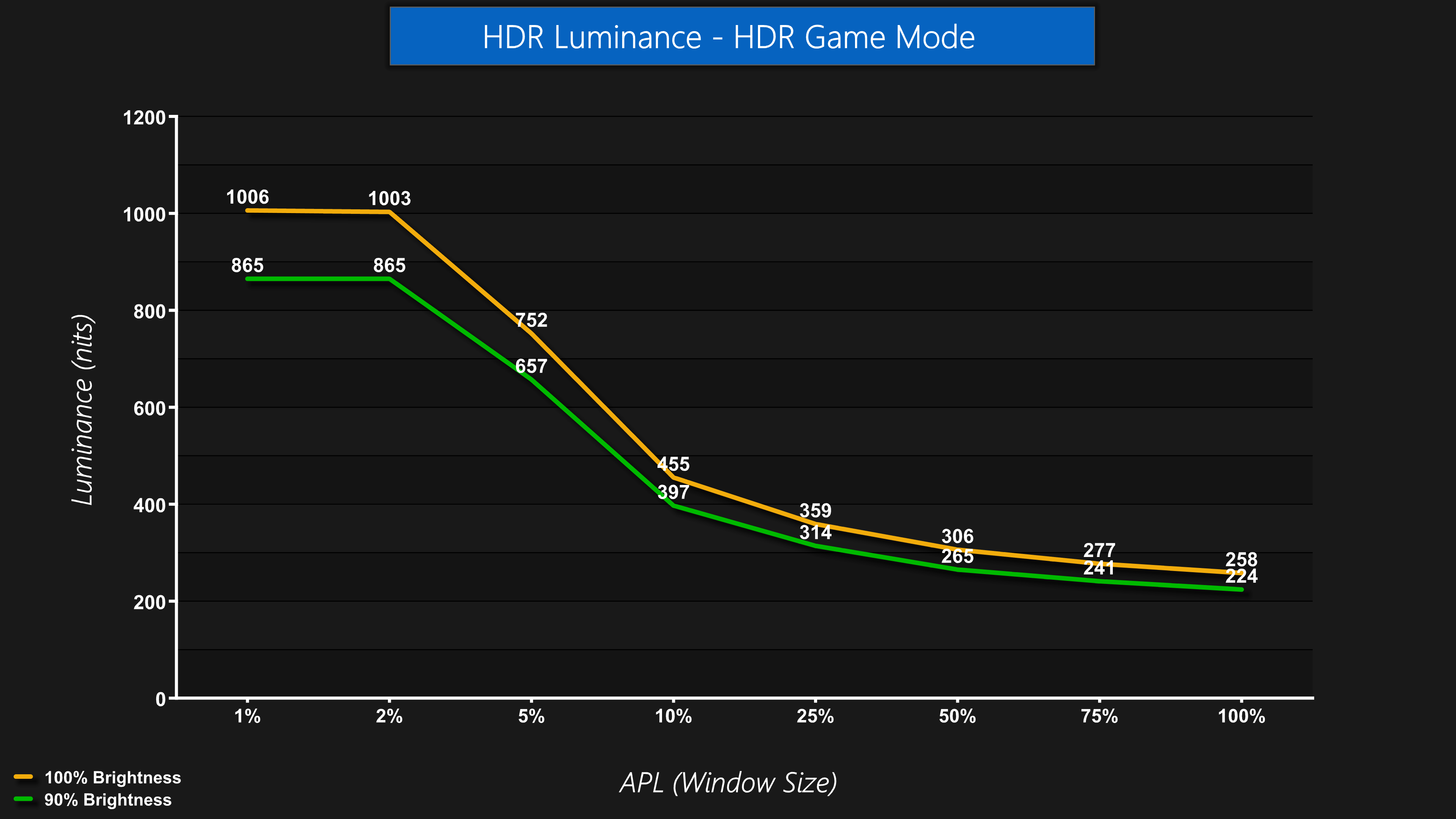 Starting our HDR testing with the luminance levels, here we are using the default HDR Game mode. Interestingly, this defaults to a 90% brightness setting, meaning we fall short of the claimed 1000 nits peak. Of course this is an easy fix, and manually increasing brightness to 100% got us just over the 1000 nit mark for 1% and 2% APLs, before dropping of as we'd expect as the window size increases.