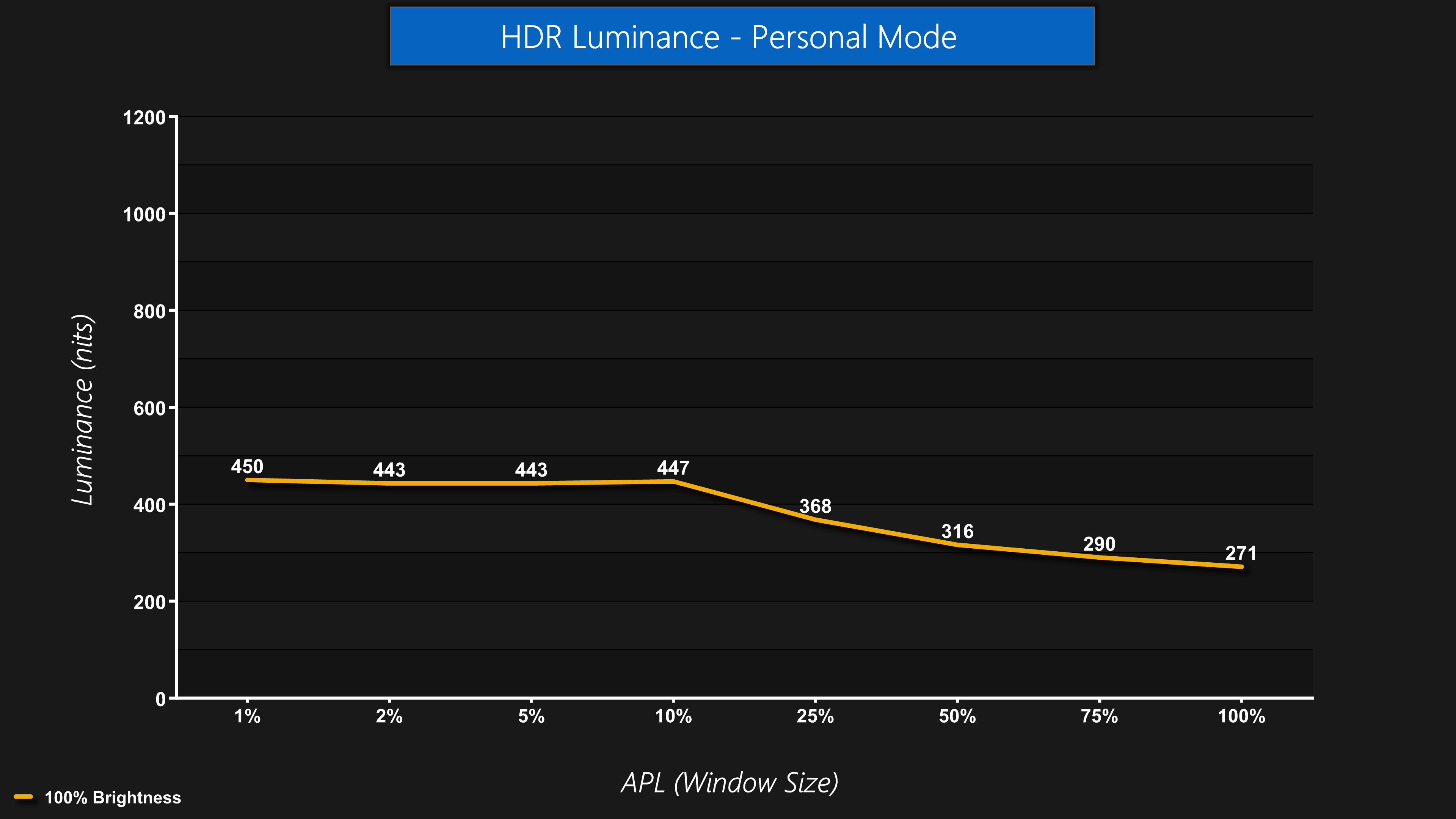 There's also an HDR Personal mode, and this behaves the same as the HDR True Black mode, by essentially limiting brightness to about 450 nits maximum, before rolling off as the window size exceeds 25%. I personally don't like using these modes, but if you find the ABL annoying when in HDR mode, this will smooth some of that out.