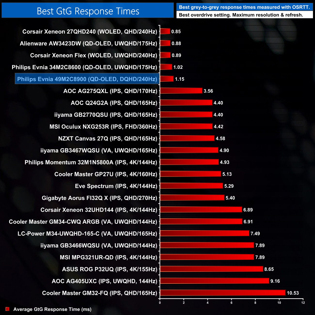 Just confirming the best response time results then, the 49M2C8900 is right up there with all the other OLED monitors we have tested and is well clear of the fastest LCD display.