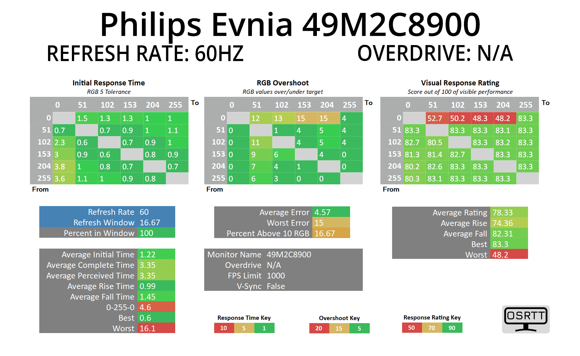 Visual Response Rating is a metric designed to ‘score' a panel's visual performance, incorporating both response times and overdrive. Fast response times with little to no overshoot will score well, while slow response times or those with significant overshoot will score poorly.
