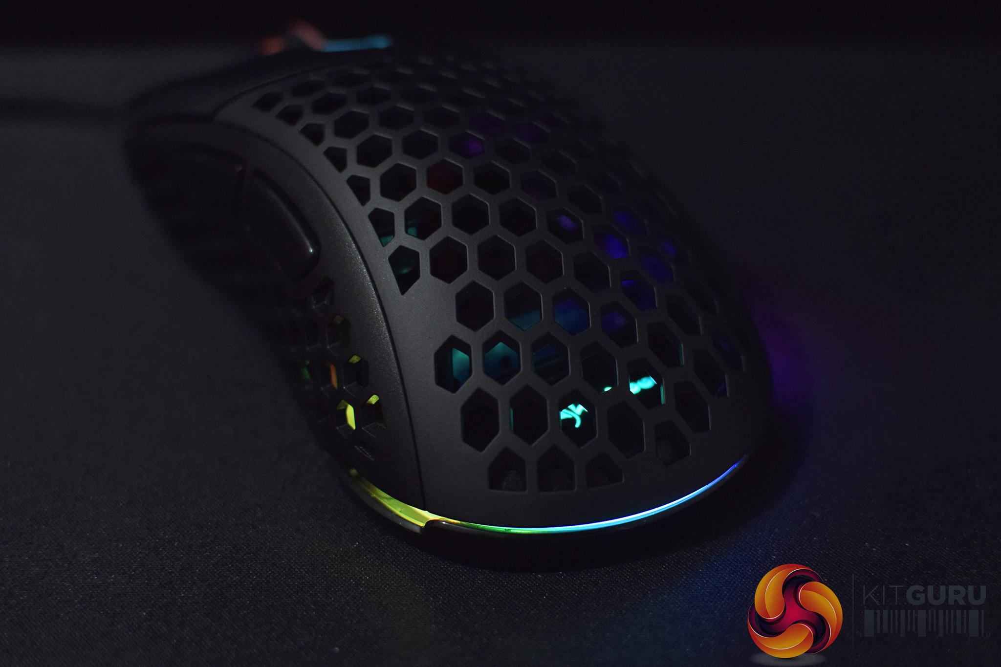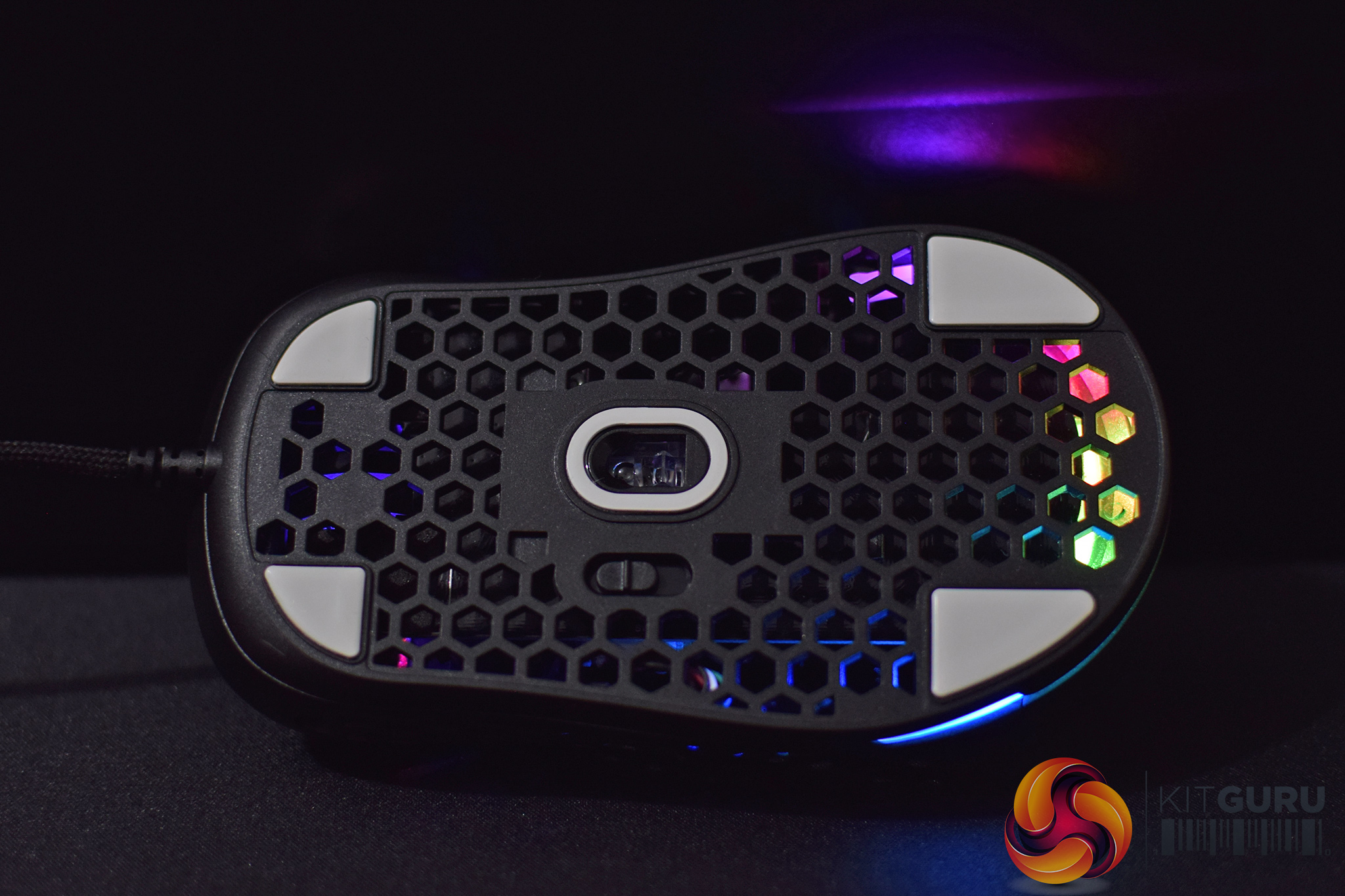 There's three RGB zones on the Light2 200 – the scroll wheel, the Sharkoon logo at the bottom of the PCB (under the shell), and then a small strip and the bottom of the mouse. I wouldn't say the mouse has blown me away with how good the RGB looks, primary because the LEDs aren't the brightest, but it's certainly passable and there's a number of effects to choose from in software.