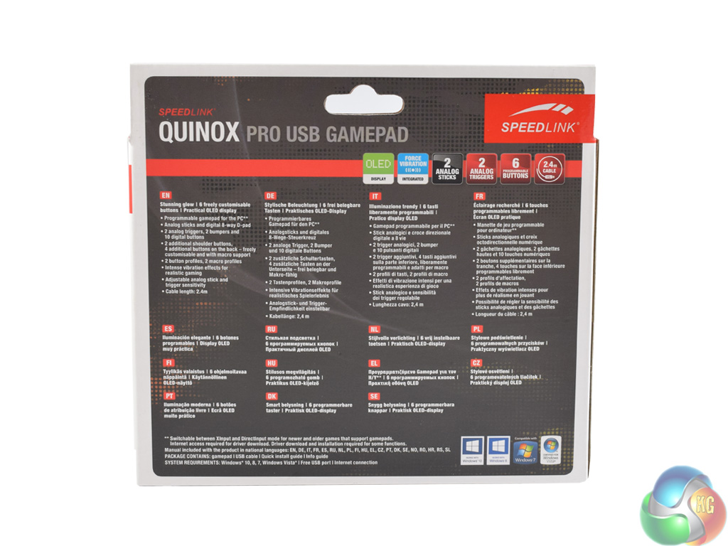 The SpeedLink Quinox ships in a colourful box. A large image of the gamepad itself dominates the front of box, while on the back we find multilingual specifications.