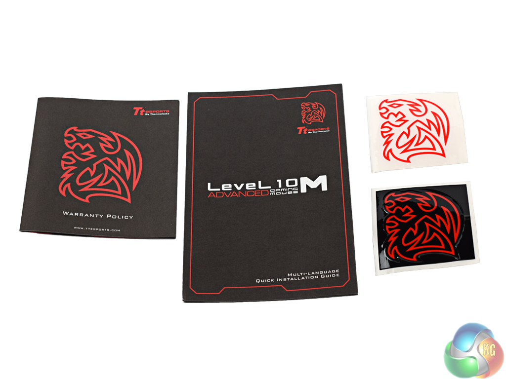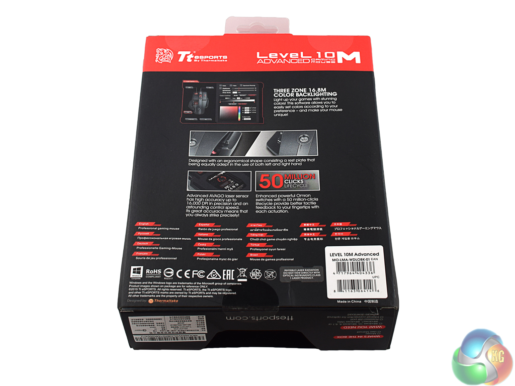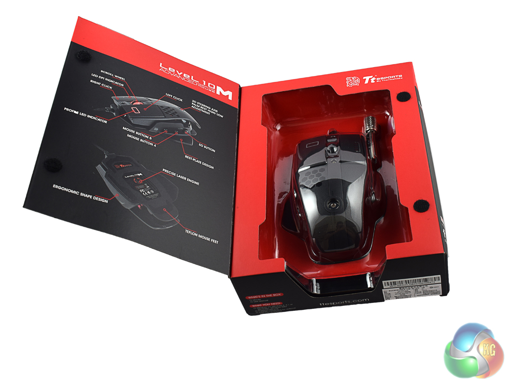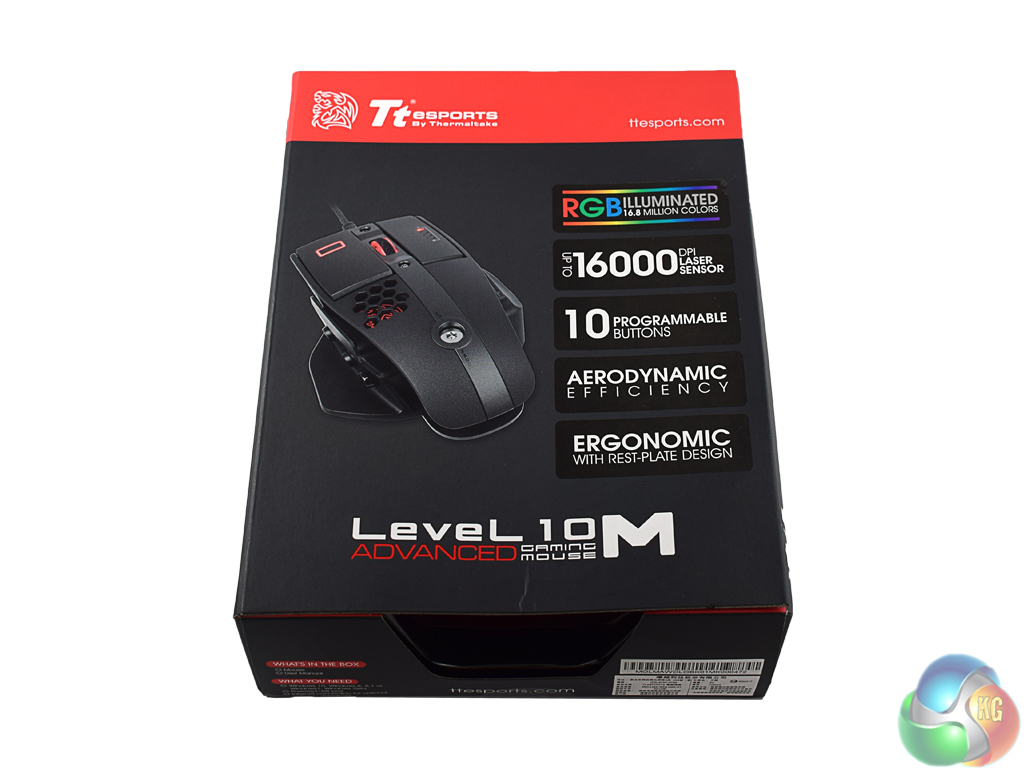 The Tt eSports Level 10M Advanced ships in a sleek black box, with a red bar at the top. A picture of the mouse is visible on the front, while some key features are also highlighted.