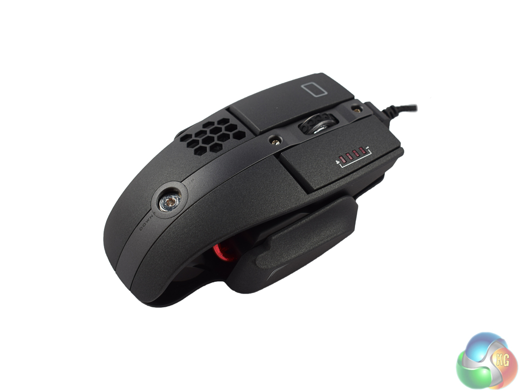 While we are here, a small rectangle is visible on the left mouse button. This is one of 3 RGB lighting zones, while the mouse wheel acts as another. The right mouse button also features four smaller LED indicators which tell you the DPI stage you are currently using.