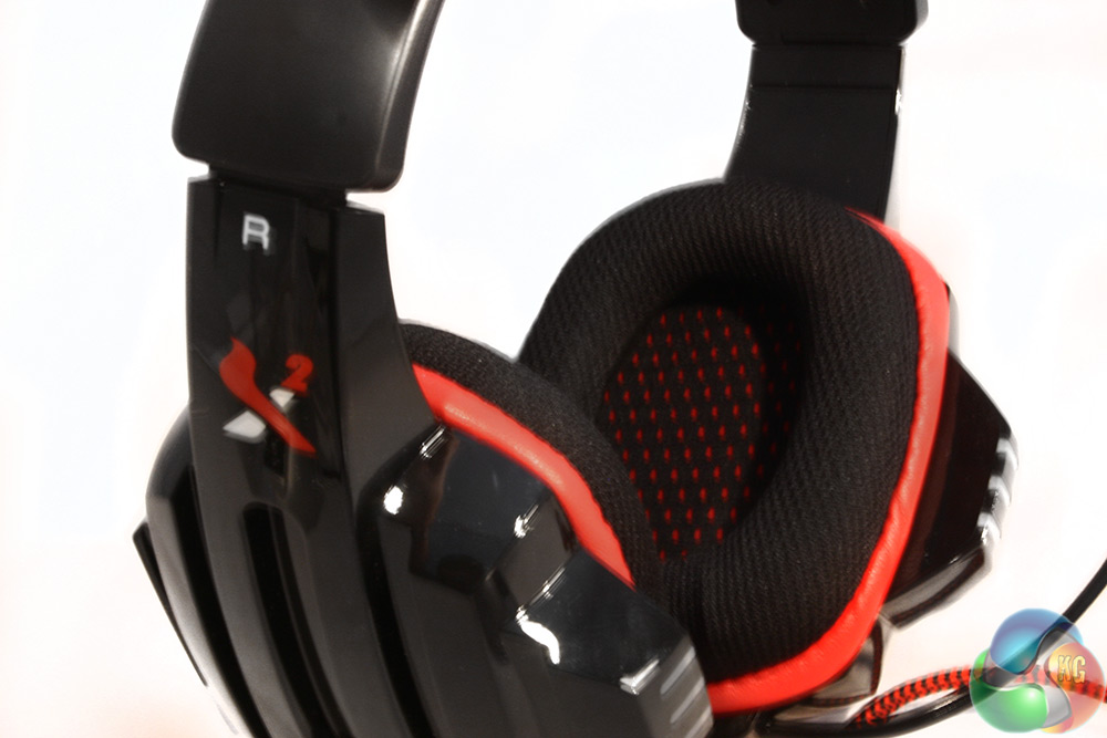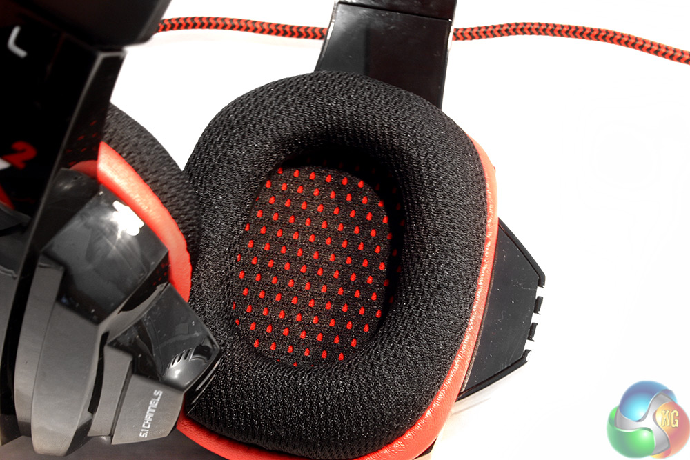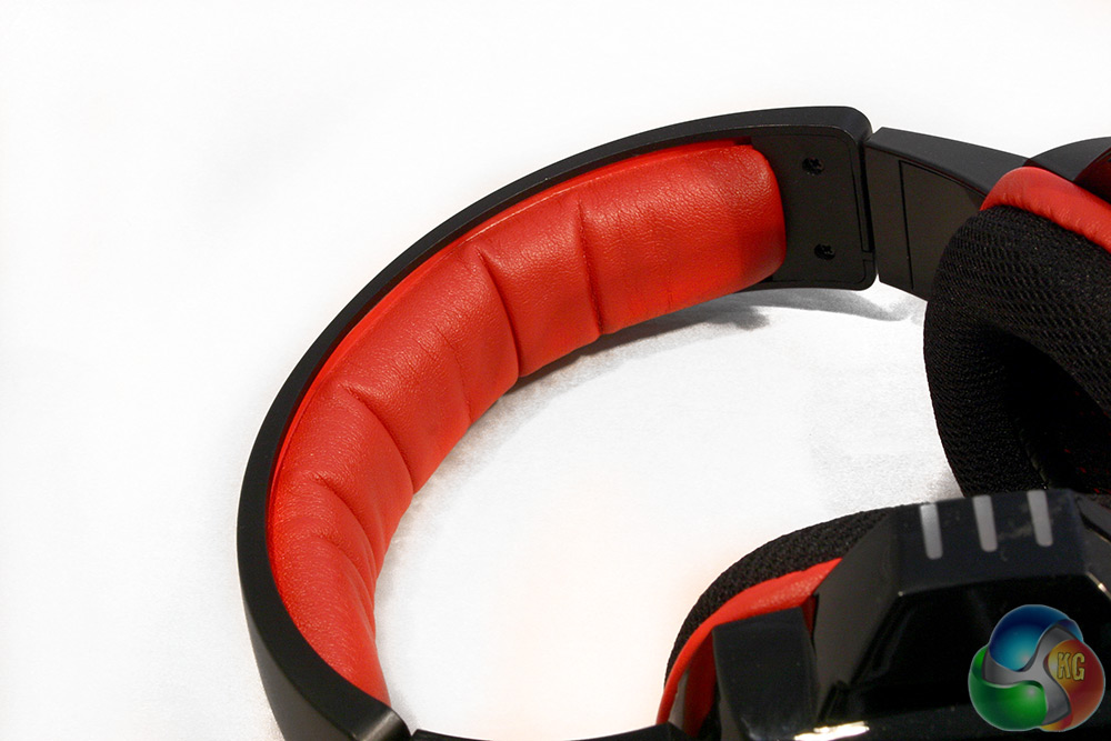 At the top end you have the full adjustable headband which should fit most heads without too much difficulty. I have an above average head for a man of my size and it sat against my ears without difficulty so you're unlikely to have any other issues. In the middle of the band is a comfortable red leather cushion that does a good job of protecting your skull during long gaming sessions.