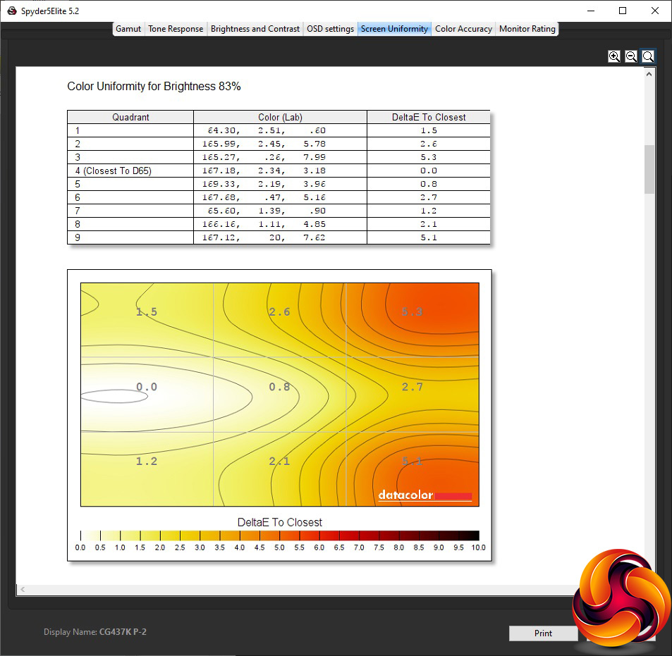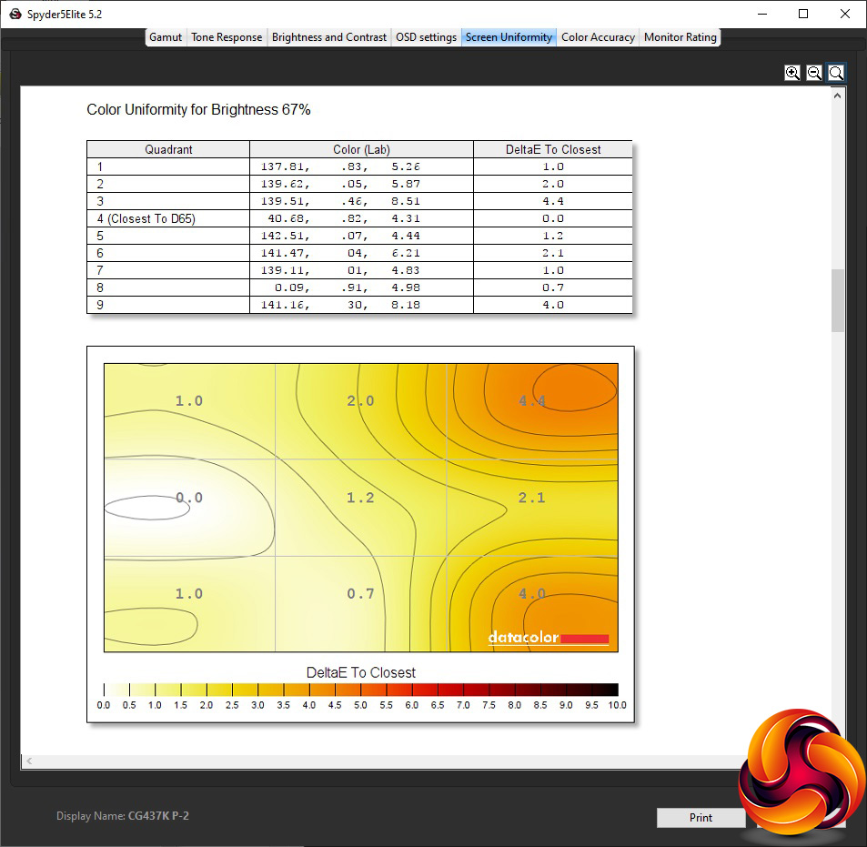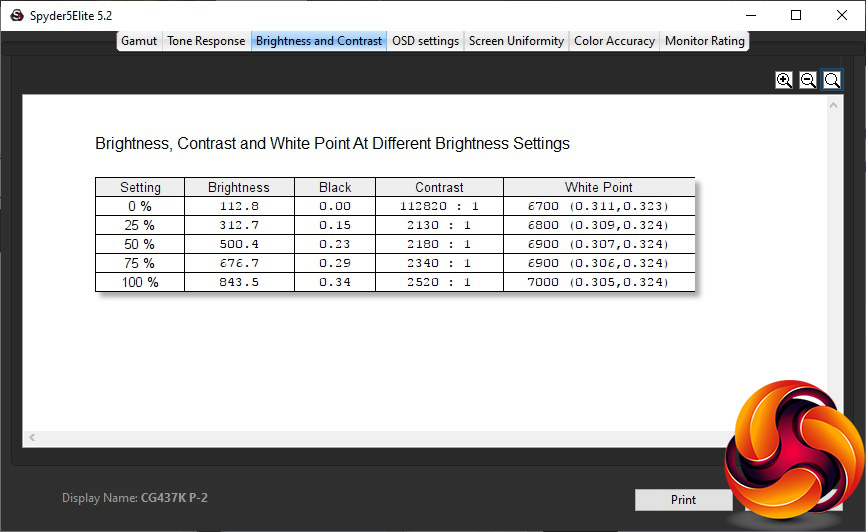 The CG437K is undeniably the brightest monitor we have ever tested, hitting 843.5cd/m2 at its highest level. The contrast is also pretty amazing, reaching 2,520:1 at 100 per cent brightness. The white point does vary a little from 6700K at zero brightness to 7000K at 100 per cent. It's also worth pointing out that this monitor never really gets that dark, returning 112.8cd/m2 even with the brightness turned all the way down.