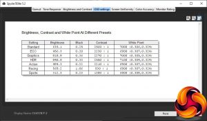 You get a decent range of preset Modes, but they are all very bright. The Standard mode offers 635.1cd/m2 and a 2,560:1 contrast, with a fairly standard 7000K white point. Even ECO mode has a 456.3cd/m2 brightness – beyond most monitors at their brightest – and 2,230:1 contrast, with 6,900K white point. Graphics mode pumps the brightness up to 818.9cd/m2, with a similar 2,270:1 contrast and 7000K white point. HDR is the brightest mode at 840.8cd/m2, with the highest 2,550:1 contrast but a similar 7100K white point.