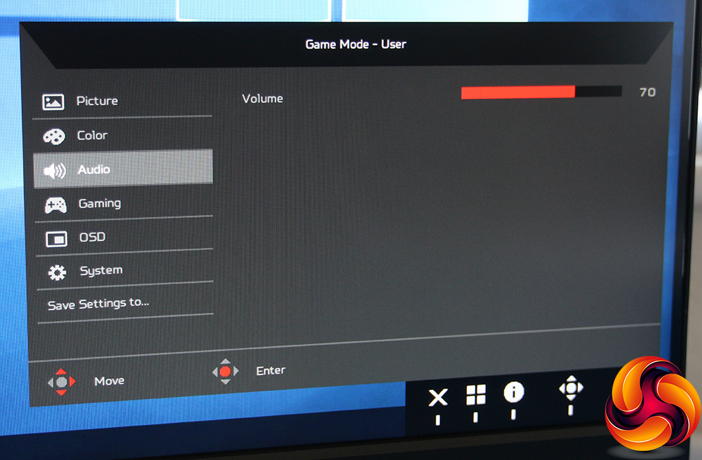 Selecting the left-most button calls up the OSD preset modes. There are three modes for gaming – Action, Racing and Sports – plus a User-configurable option. For more work-focused and everyday activities, there is a Standard mode, plus ECO, Graphics and Movie. So the most usual monitor functions are covered.