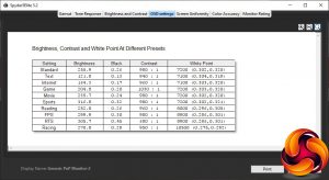 Moving to the Games Modes, which were tested in Standard Eco Mode, all are bright. The FPS mode opts for 299.9cd/m2, with a standard 980:1 contrast but very cool 8900K white point. The RTS option is brightest of the Games Modes, hitting 305.7cd/m2, but a lower 680:1 contrast and the same cool 8900K white point as FPS mode. Racing mode hits the coolest 10500K white point, but uses a 270.8cd/m2 brightness and 950:1 contrast.