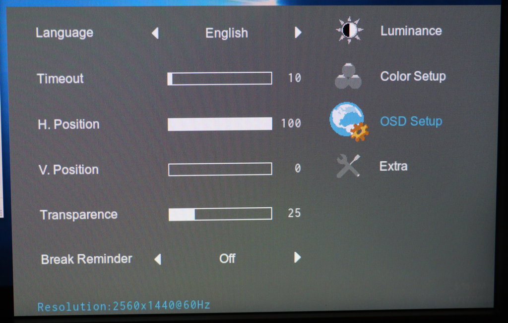 The OSD Setup section allows you to adjust how the OSD is displayed, and you can set up a reminder to tell you to take a screen break at certain intervals.