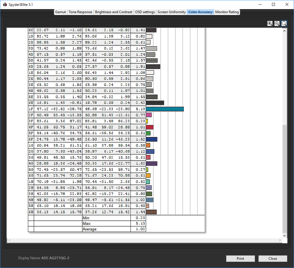 Colour fidelity is where IPS panels really pull away from their TN competitors, and without any calibration the AG271QG is much more faithful than the AG271QX, and indeed very good overall with a score of 1.02.
