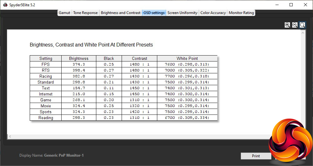 - A monitor’s contrast ratio at various brightness levels in the OSD.