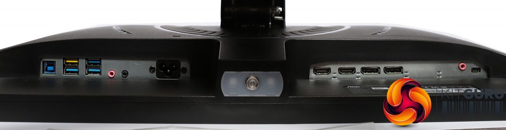 The ports are liberally arranged either side of the bottom edge of the stand. The left-hand side from the front (shown on the right above) is where the video ports are located, including two HDMI 2.0 and two DisplayPort 1.4. Note that you will need to use one of the latter for 240Hz refresh. HDMI 2.0 only supports 144Hz at this monitor's resolution. Further along is a microphone input and the connection for the external control puck. The one omission here is USB-C.