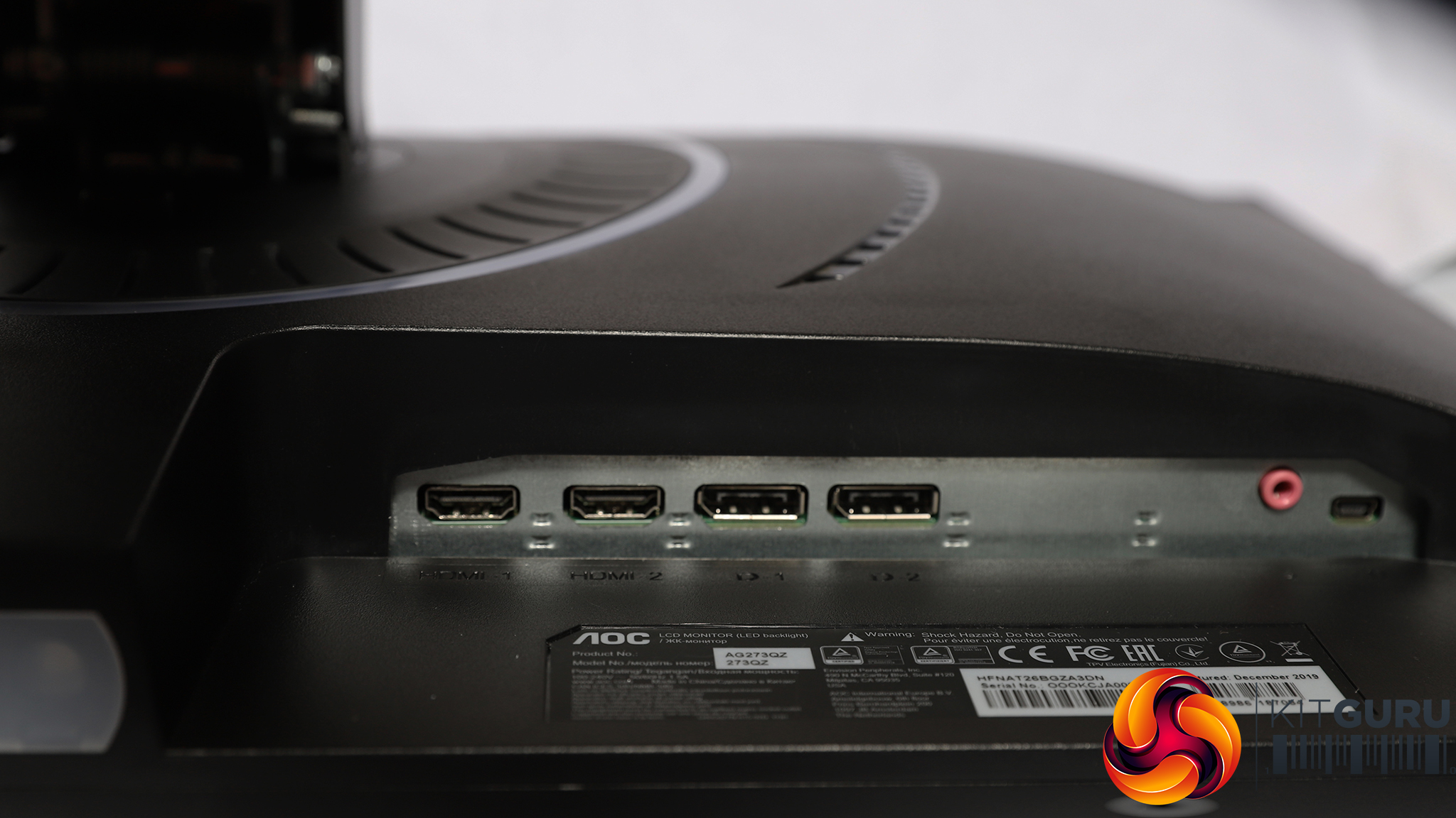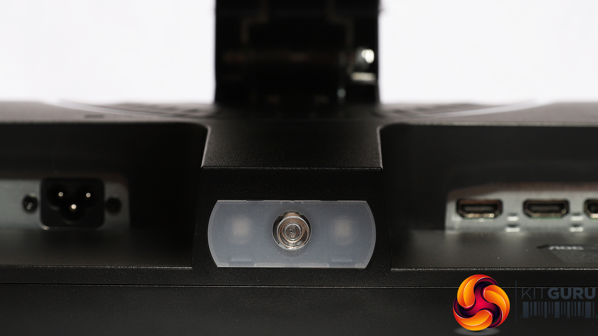The ports are liberally arranged either side of the bottom edge of the stand. The left-hand side from the front (shown on the right above) is where the video ports are located, including two HDMI 2.0 and two DisplayPort 1.4. Note that you will need to use one of the latter for 240Hz refresh. HDMI 2.0 only supports 144Hz at this monitor's resolution. Further along is a microphone input and the connection for the external control puck. The one omission here is USB-C.