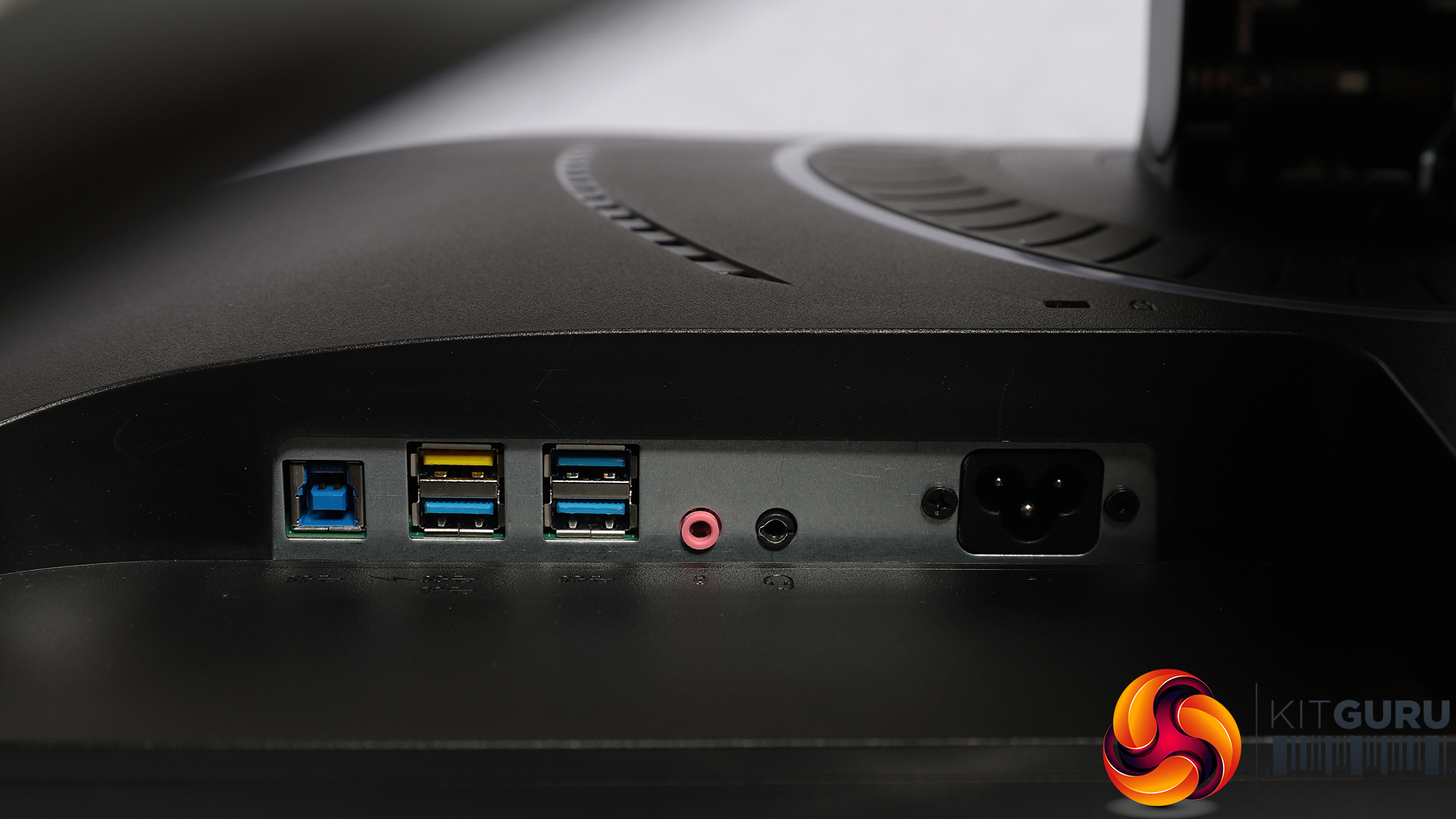 The other side of the stand is home to the power plug, analog minijacks for microphone input and combo headset, plus the four-port USB 3.2 Gen1 hub, with one yellow port that is always on even when the monitor is otherwise powered down.