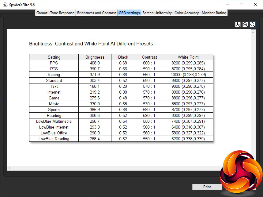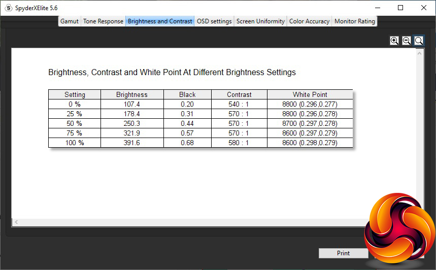 - A monitor’s contrast ratio at various brightness levels in the OSD.
