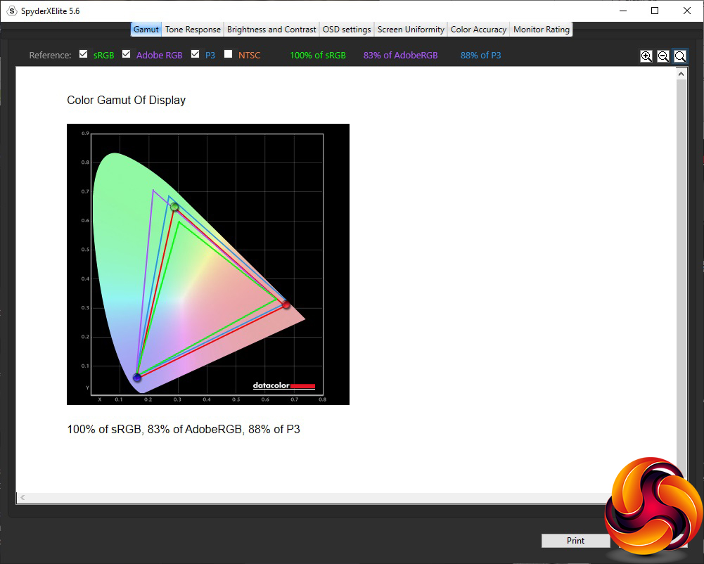 After calibration, the gamut has hardly changed at all, with 100 per cent sRGB, 83 per cent AdobeRGB, and 88 per cent DCI-P3 (a decrease of 1 per cent).