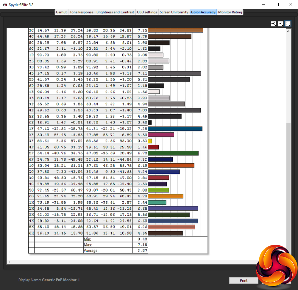 The default colour accuracy of 3.87 on average is not that great. This isn't a terrible score, but it's a shame that you can't rely on top-notch colour out of the box. So, as usual, we calibrated the screen with the Spyder to see if we could improve things.