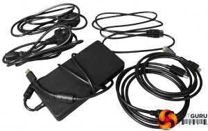 Inside, you get the separate power brick and kettle lead cables for UK and European mains power. There's a USB upstream cable, plus HDMI and DisplayPort wiring. So all your connectivity bases are belong to us. Missing from our sample when we photographed it were a minijack cable for the microphone pass-through, and the Quick Switch puck, of which more later.