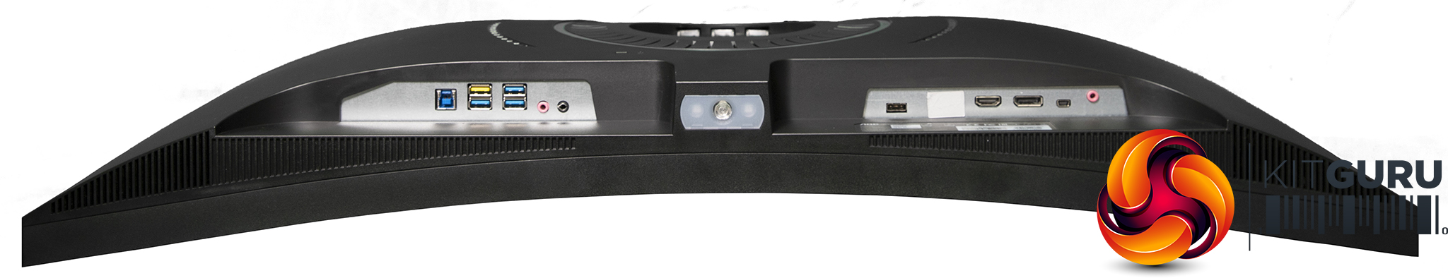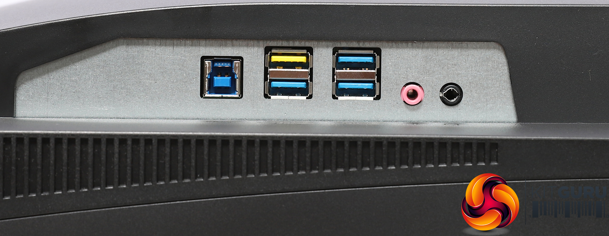 The ports are ranged either side of the stand underneath. From the front, the left-hand side is home to the four-port USB 3.1 Gen1 hub, with one port supporting fast charging. The analog headphone and audio inputs are on this side too. Moving to what is the left-hand side from the front, the port that looks like another USB is for the external power input.