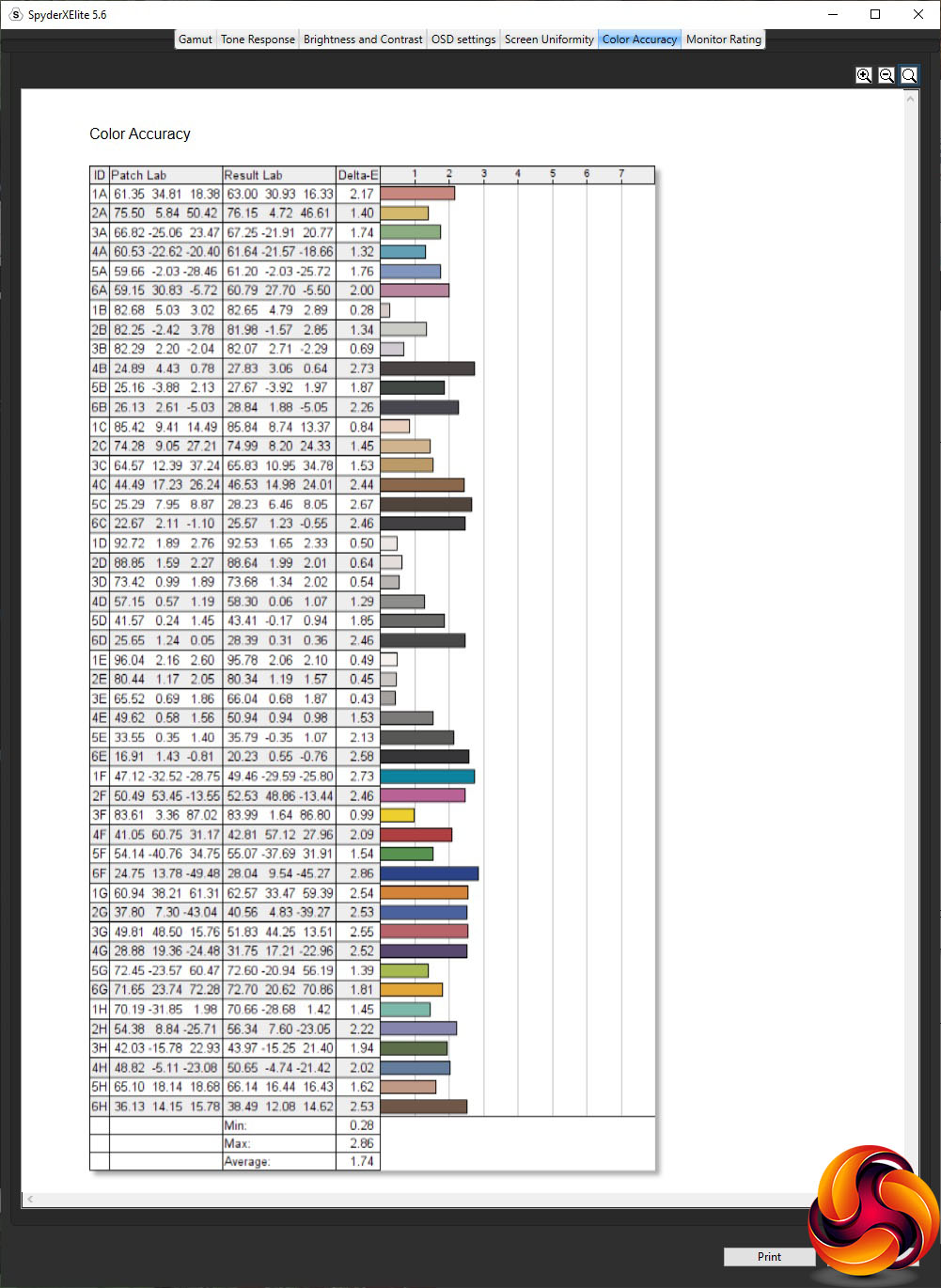 However, the colour accuracy of an average 1.74 deviance is merely good. We expected better, so of course we moved onto calibrating the monitor with the SpyderX.