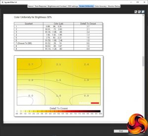 Our main test involves using a DataColor SpyderX Colorimeter to assess a display’s image quality. The device sits on top of the screen while the software generates colour tones and patterns, which it compares against predetermined values to work out how accurate the screen is.