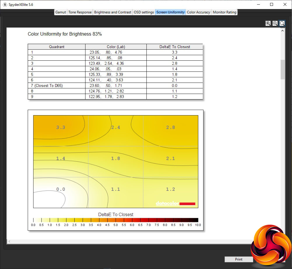 Brightness uniformity is also nothing to worry about, with only the bottom right corner at 10 per cent aberration and top left at 9.5 per cent.